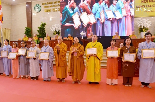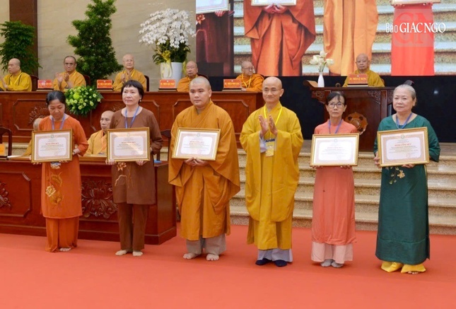 Dịp này, Ban Trị sự GHPGVN TP.HCM đã tặng Bằng tuyên dương công đức cho tập thể Ban Giáo dục Phật giáo Thành phố; Bằng công đức đến 7 tập thể và 29 cá nhân.