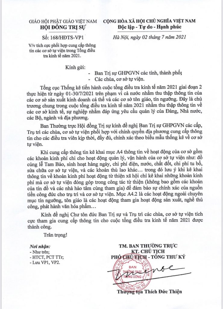 Sáng ngày 2/7/2021 Hội đồng Trị sự Trung ương Giáo hội Phật giáo (GHPG) Việt Nam ra Văn bản số 168/HĐTS-VP1 do Thượng tọa Thích Đức Thiện – Phó Chủ tịch kiêm Tổng Thư ký GHPGVN ký, gửi đến Ban Trị sự GHPGVN các tỉnh, thành phổ; Các chùa, cơ sở tự viện, về việc tích cực phối hợp cung cấp thông tin các cơ sở tự viện trong Tổng điều tra kinh tế năm 2021.