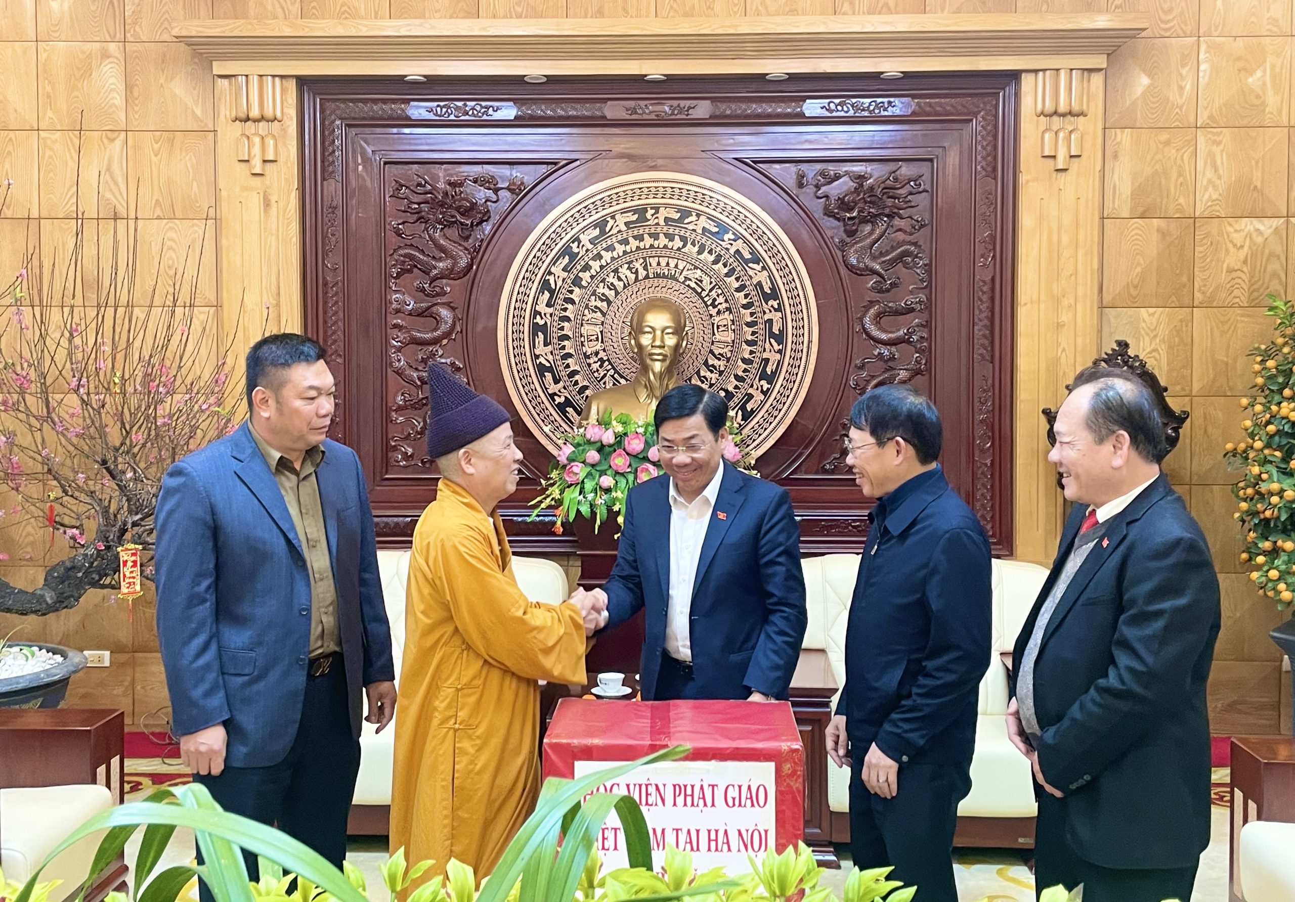 Ông Dương Văn Thái – Bí thư Tỉnh uỷ đã phấn khởi thông báo với Hòa thượng Thích Thanh Quyết và đoàn về những kết quả nổi bật trong phát triển kinh tế-xã hội của tỉnh năm 2022.