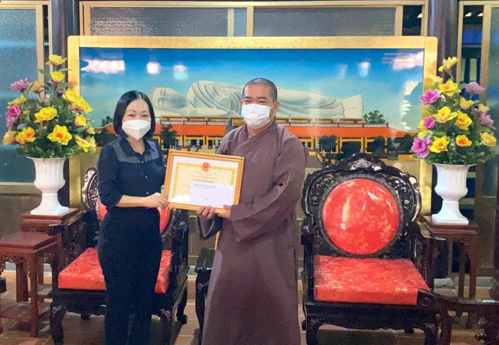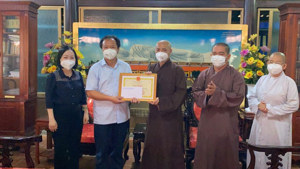 Đoàn do Ông Nguyễn Văn Đông – Ủy viên Thường vụ Tỉnh uỷ, Bí thư Thành uỷ TP. Thủ Dầu Một; bà Nguyễn Thu Cúc – Chủ tịch UBND thành phố Thủ Dầu Một đến trao tặng bằng khen cho tập thể Ban Trị sự GHPGVN tỉnh Bình Dương; 02 cá nhân là HT. Thích Huệ Thông – Phó Tổng Thư ký HĐTS, Chánh Văn phòng II TƯGH, Trưởng ban Trị sự GHPGVN tỉnh Bình Dương, trụ trì Tổ đình Hội Khánh và Đại đức Thích Thiện Hưng – Chánh Thư ký BTS Phật giáo tỉnh.