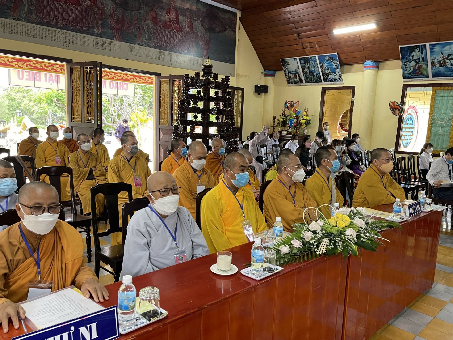 Đại đức Thích Nguyên Phát – Phó Thư ký, Chánh Văn phòng Ban Trị sự Phật giáo huyện trình bày Báo cáo Tổng kết Công tác Phật sự nhiệm kỳ 2016- 2021. Thượng tọa Thích Từ Minh – Phó Ban Trị sự Phật giáo huyện trình bày phương hướng hoạt động nhiệm kỳ mới 2021-2026.