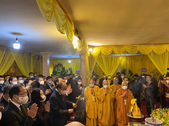 Phái đoàn đại diện lãnh đạo Đảng, Quốc hội, Chính phủ, Bộ Nội Vụ, Ban Dân vận, Ủy ban Trung ương MTTQVN, Ban Tôn giáo Chính phủ, UBND TP. Hà Nội do Ông Nguyễn Xuân Phúc, Ủy viên Bộ Chính trị, Chủ tịch nước làm trưởng đoàn, đoàn viếng còn có Phó Thủ tướng Phạm Bình Minh, Bà Bùi Thị Minh Hoài Trưởng Ban Dân vận, Bộ trưởng Bộ Nội vụ Phạm Thị Thanh Trà… cùng thành kính dâng hương và đặt vòng hoa kính viếng Giác linh Đức Pháp chủ – Đại lão Hòa thượng Thích Phổ Tuệ.