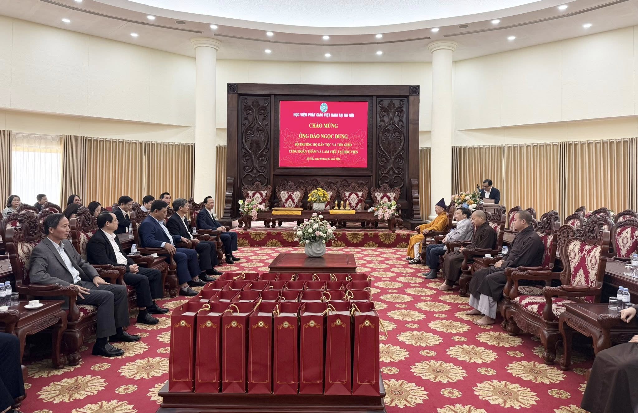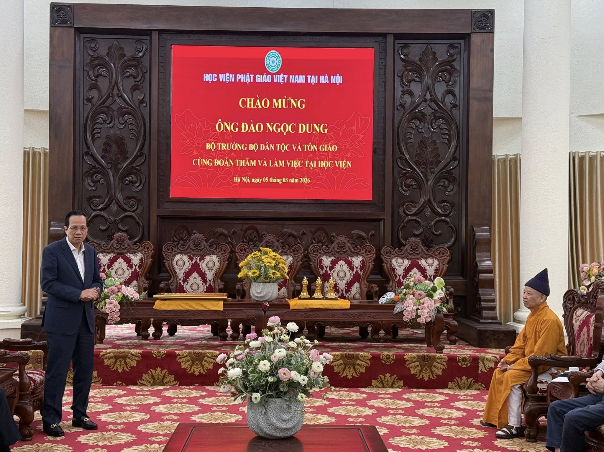 Nhân dịp xuân Bính Ngọ 2026, sáng ngày 5/3, ông Đào Ngọc Dung, Bộ trưởng Bộ Dân tộc và Tôn giáo cùng đoàn đã đến thăm và làm việc tại Học viện. Đi cùng đoàn còn có hai Thứ trưởng Bộ Dân tộc và Tôn Giáo Y Vinh Tơr và Nguyễn Hải Trung; ông Vũ Hoài Bắc, Trưởng ban Tôn giáo Chính phủ. Đón tiếp đoàn có Hoà thượng Thích Thanh Quyết; Giáo sư Lương Gia Tĩnh cùng Văn phòng. Trước buổi gặp, đoàn lên chùa Non Nước dâng hương lễ Phật, cầu nguyện năm mới Quốc thái dân an, sức khoẻ, an khang.