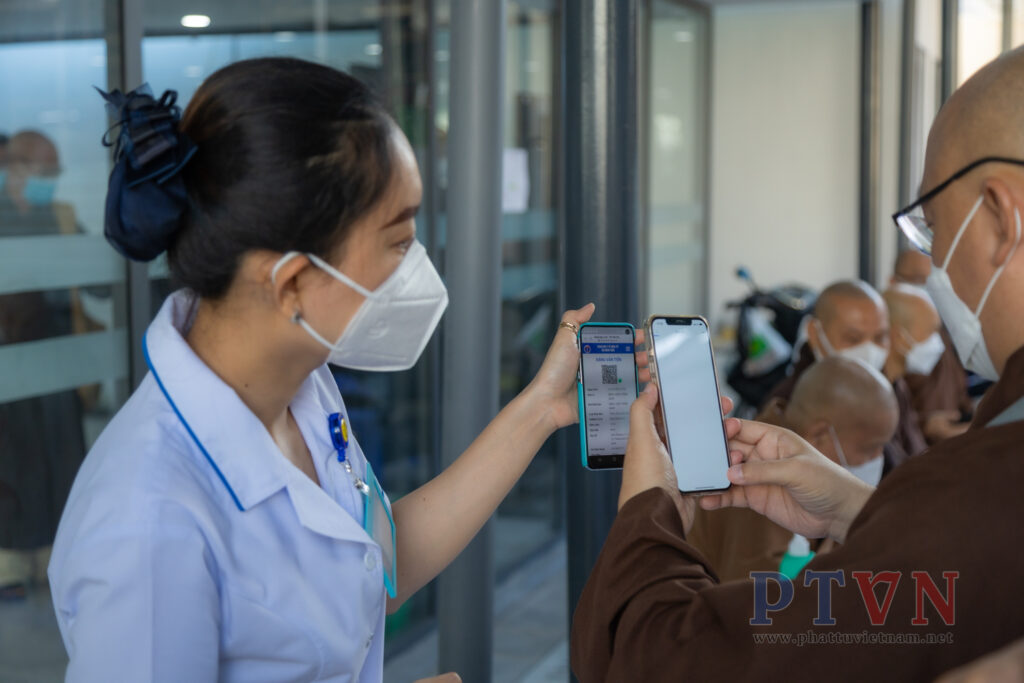 Sau khi tiêm xong, nhân viên y tế tại bệnh viện đã trao nhận giấy xác nhận tiêm vắc-xin phòng Covid-19 và mong chư Tôn đức thực hiện đầy đủ các khuyến cáo tự theo dõi sức khoẻ bản thân.