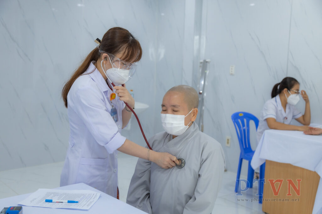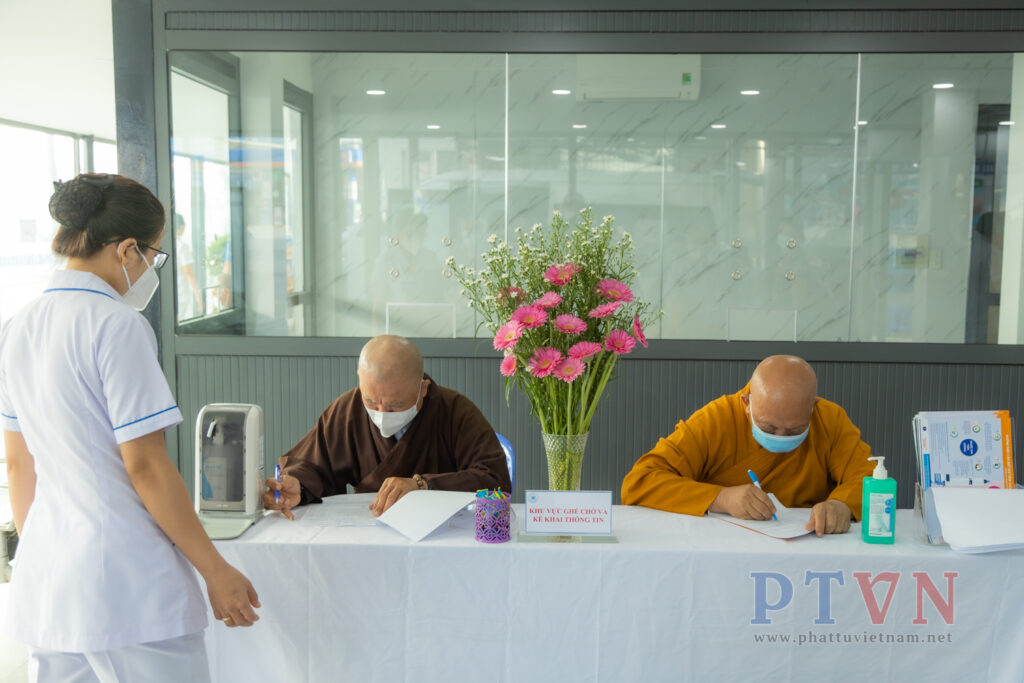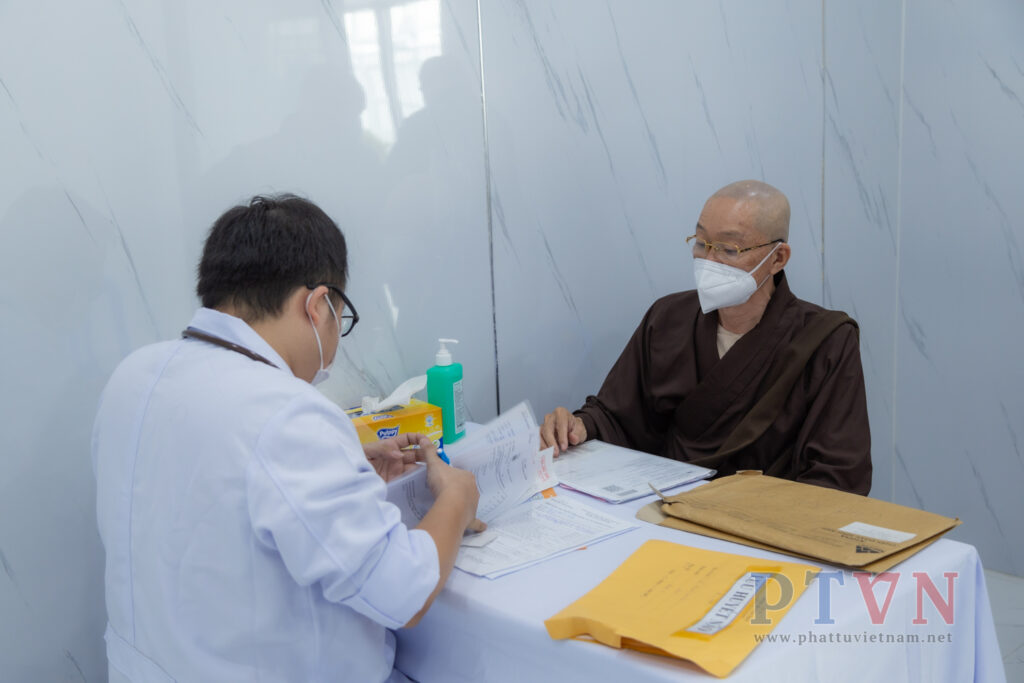 Tại đây, chư Tôn đức đã được sự hướng dẫn của y bác sĩ về việc khai báo y tế, kiểm tra sức khoẻ và một số thủ tục liên quan.