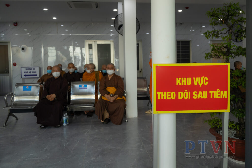 Sau khi tiêm chủng xong, chư Tôn đức đã lưu lại tại khu vực theo dõi sau tiêm trong thời gian tối thiểu 30 phút trước khi về.