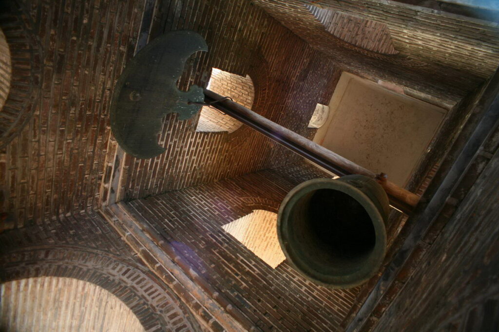 Trong tháp có 4 tượng Thiên Vương cao 1,6 m ở bốn góc, phía trên treo một quả chuông đồng đúc năm 1793 và một chiếc khánh đúc năm 1817.