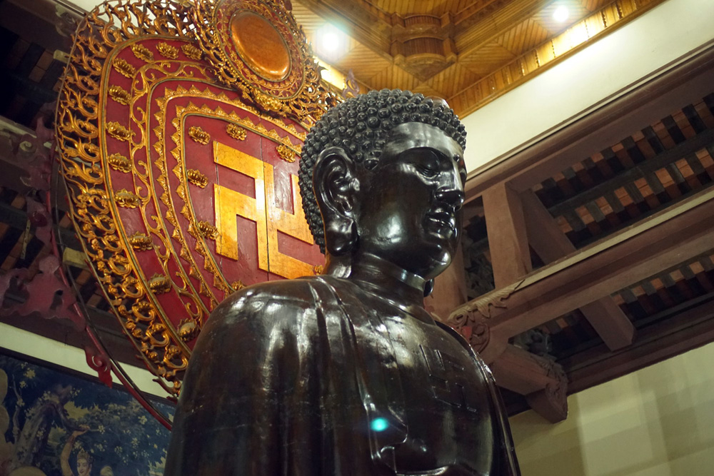 Để làm được bức tượng này, Hoà thượng Thích Thanh Tường – trụ trì chùa thời bấy giờ đã phải mời các vị sư và các nhà nghiên cứu Phật học của ba nước Đông Dương về tham dự hội thảo để có thể đưa ra những phương án tốt nhất cho hình mẫu bức tượng, khi được tất cả các đại biểu tham dự hội thảo đồng ý duyệt phần nội dung và hình thức thì công việc đúc tượng mới được tiến hành. Phải mất đến hai năm (từ 1949 – 1951) mới làm xong khuôn tượng, và đến năm 1952 tượng mới được đúc xong. Pho tượng thể hiện được thần thái cân đối, tươi sáng, an nhiên tự tại, và cực lạc… thể hiện trình độ đúc đồng rất tinh xảo, mà tất cả đều được làm thủ công nhờ đôi bàn tay tài hoa của những người thợ đúc đồng làng Ngũ Xã. Sau khi đúc xong, tượng được vận chuyển bằng tời vào ngay chính điện đặt trên toà sen sau đó Hoà thượng cho làm lễ hô thần nhập tượng và an vị tượng xong mới bắt đầu cho trùng tu lại chùa.