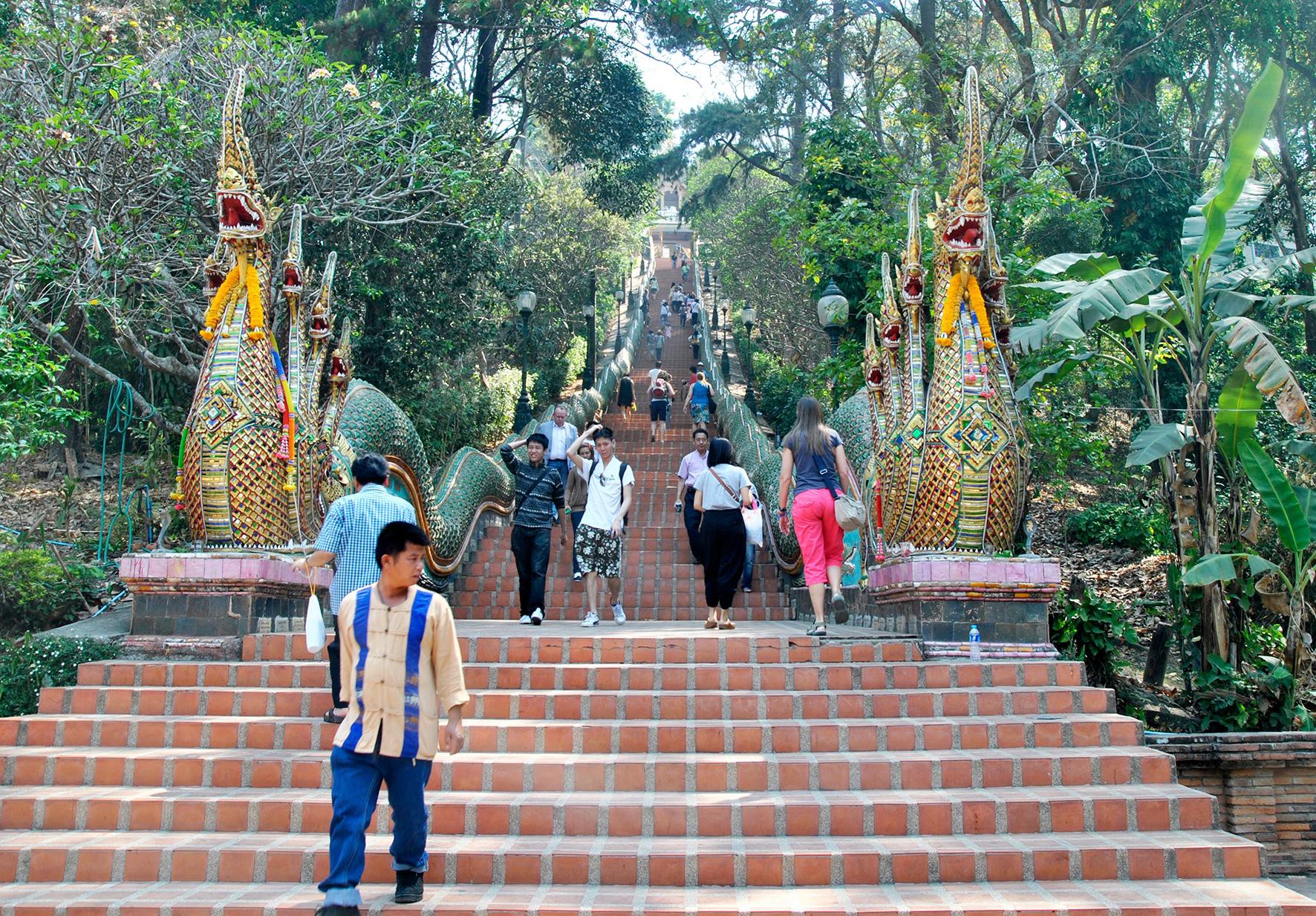 Nếu đi cáp treo chỉ mất mươi phút nhưng chúng tôi quyết định di chuyển bằng mô tô qua con đường dốc quanh co như xoáy tròn với những khúc cua ngoặt khuỷu tay khá nguy hiểm để đến lưng chừng núi, sau đó leo hơn 300 bậc tam cấp để lên chùa Phrathat Doi Suthep. Dọc theo hàng trăm bậc thang là 2 con rồng đá lớn.