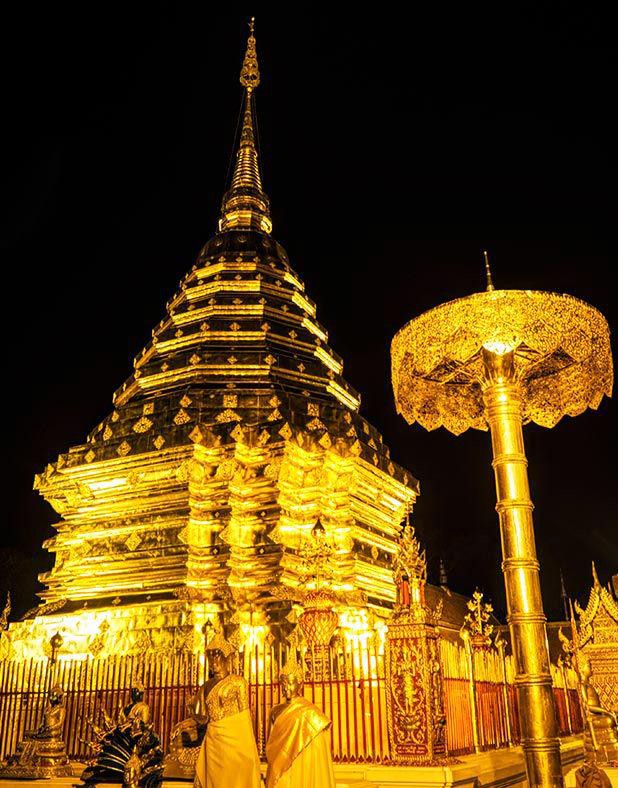 Không chỉ được dát vàng lộng lẫy mà còn lưu giữ xá lợi Phật linh thiêng, ngôi chùa Phrathat Doi Suthep thu hút du khách. Nhiều người cho rằng chuyến du lịch thành phố cổ Chiang Mai (Thái Lan) sẽ không trọn vẹn nếu bỏ qua ngôi chùa hơn 600 tuổi tọa lạc trên đỉnh núi cao hơn 1.650m này.