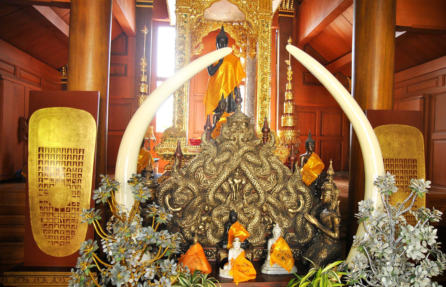 Những nhà sư mặc áo vàng cài chéo qua người ngồi hai bên dãy hành lang của ngôi đền cùng quỳ lạy và đọc kinh. Sau khi lễ Phật, khách hành hương thường được các nhà sư làm phép bằng cách buộc vào cổ tay một sợi dây màu trắng và vẩy lên người vài giọt nước và tụng kinh, rồi thỉnh vài tiếng chuông. Người Thái cho rằng, ai được các nhà sư làm phép cũng sẽ được Phật phù hộ cho may mắn, bình an.