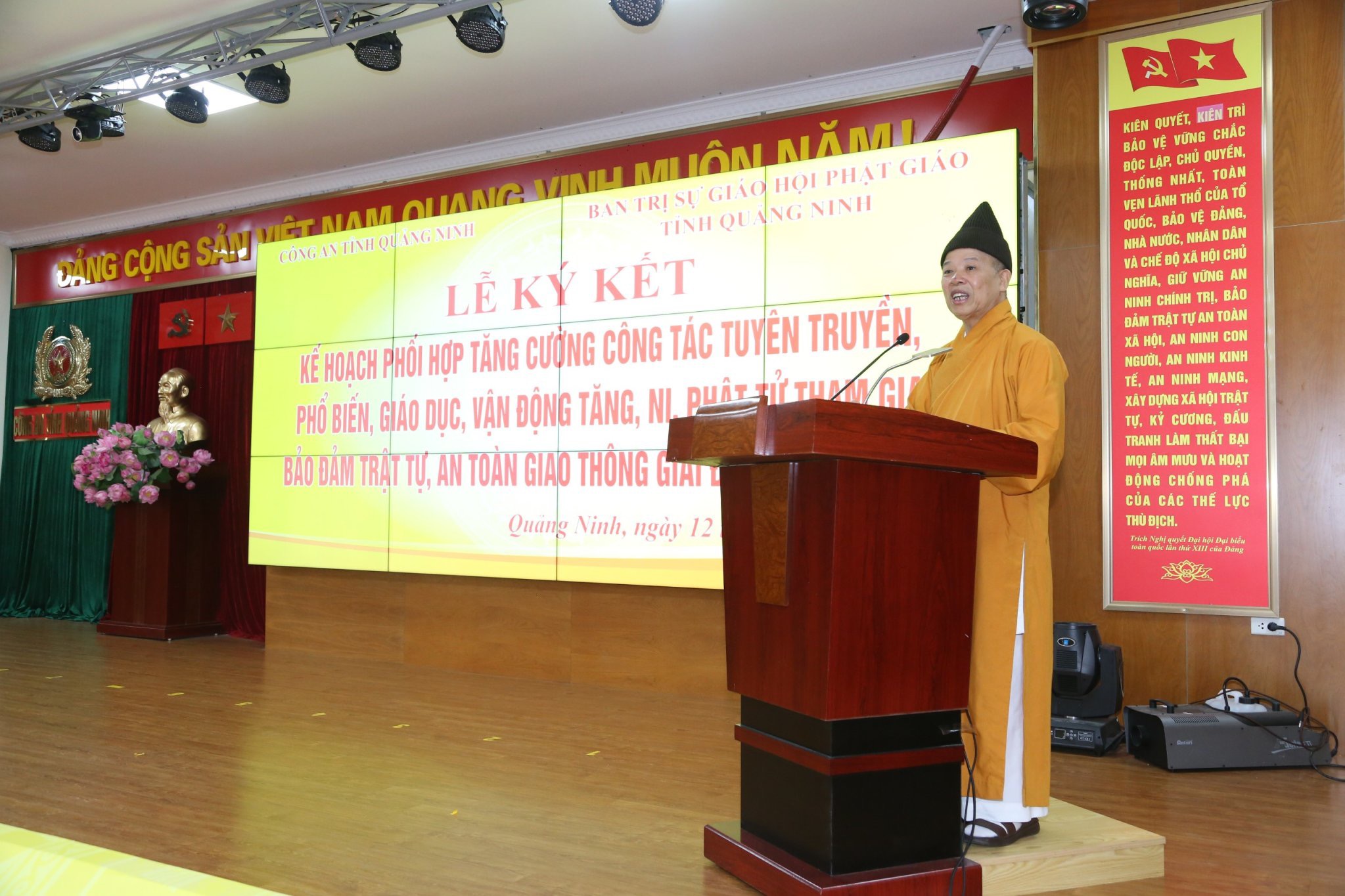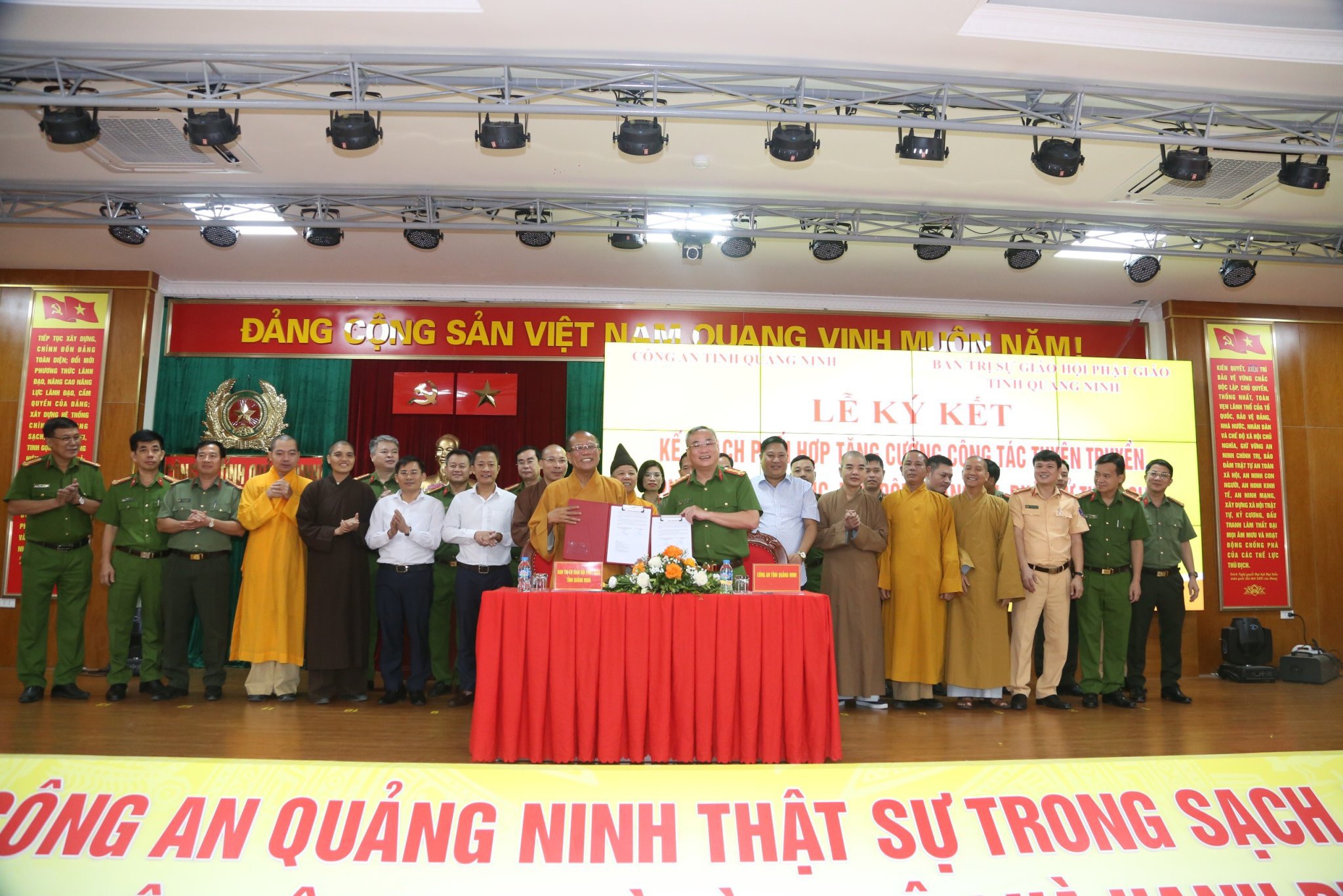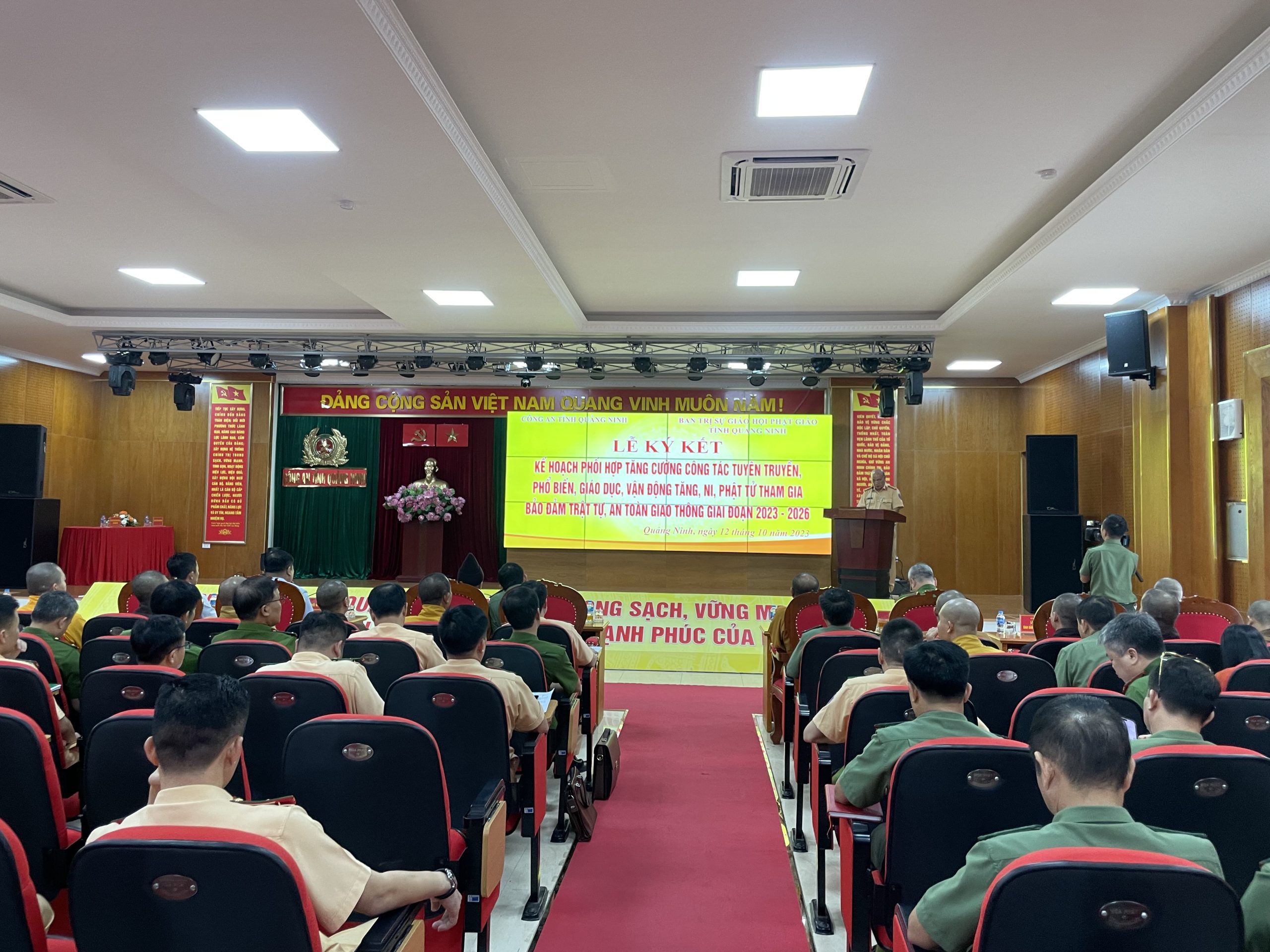 Sáng nay, 12/10/2023, tại Hạ Long, Công an tỉnh Quảng Ninh cùng Ban Trị sự Giáo hội Phật giáo tỉnh tổ chức Lễ ký kết kế hoạch phối hợp tăng cường công tác tuyên truyền, phổ biến, giáo dục, vận động Tăng, Ni, Phật tử tham gia bảo đảm trật tự, an toàn giao thông giao đoạn 2023-2026.