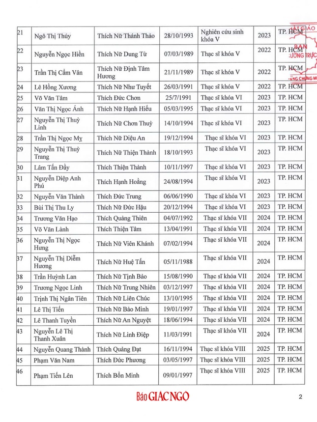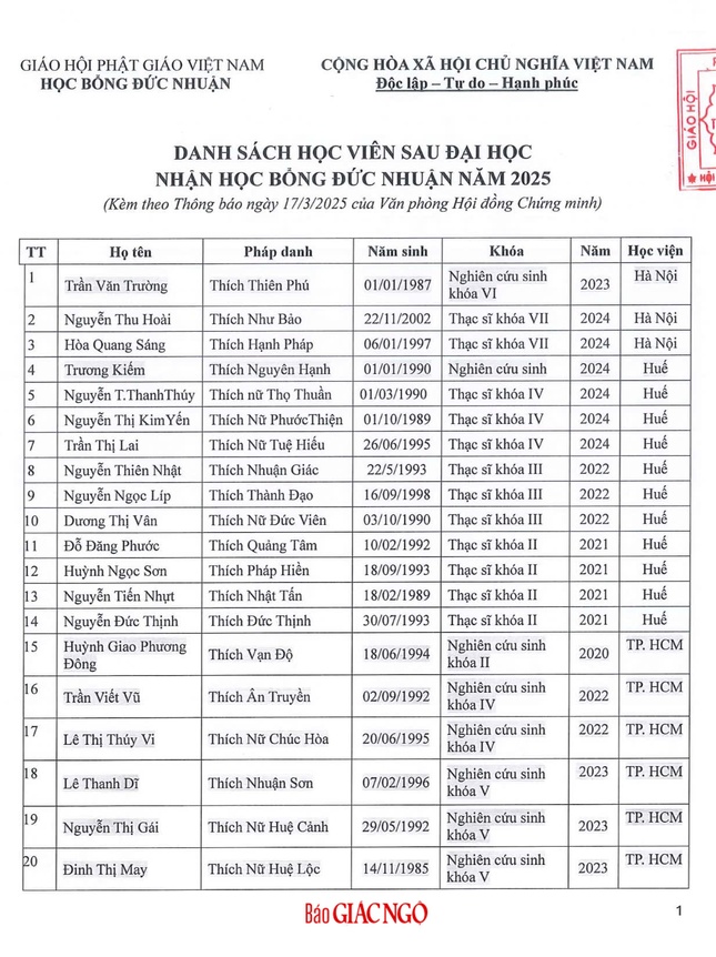 Sau đây là danh sách 51 Tăng Ni là nghiên cứu sinh tiến sĩ, học viên thạc sĩ và sinh viên chuyên ngành Sanskrit chính thức được nhận học bổng Đức Nhuận năm 2025 của Hội đồng Chứng minh GHPGVN: