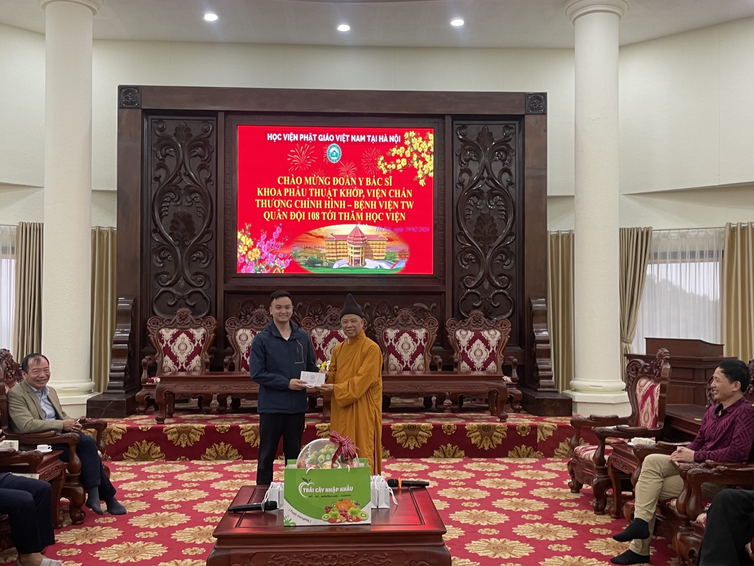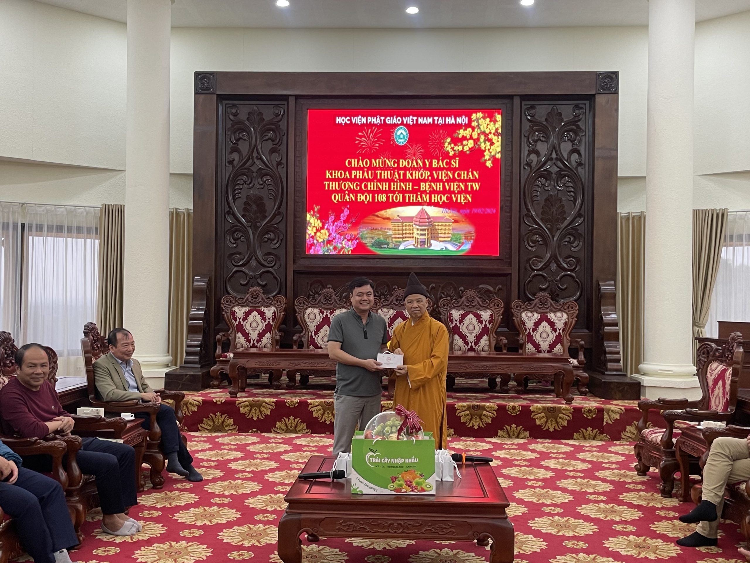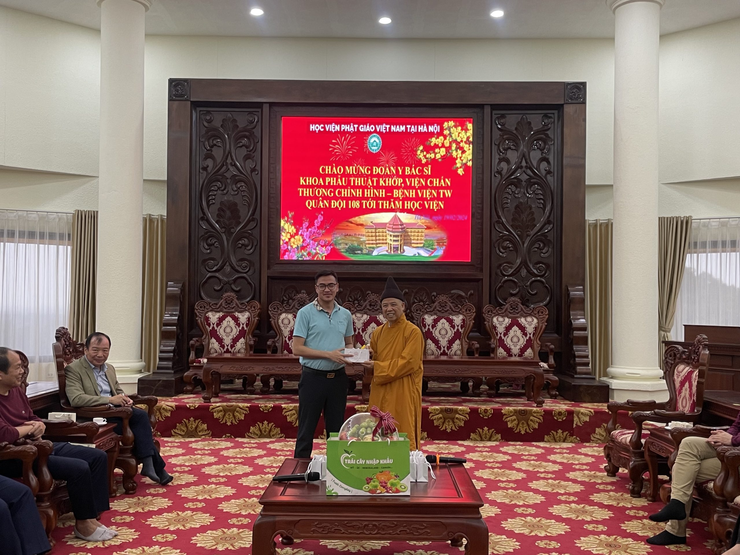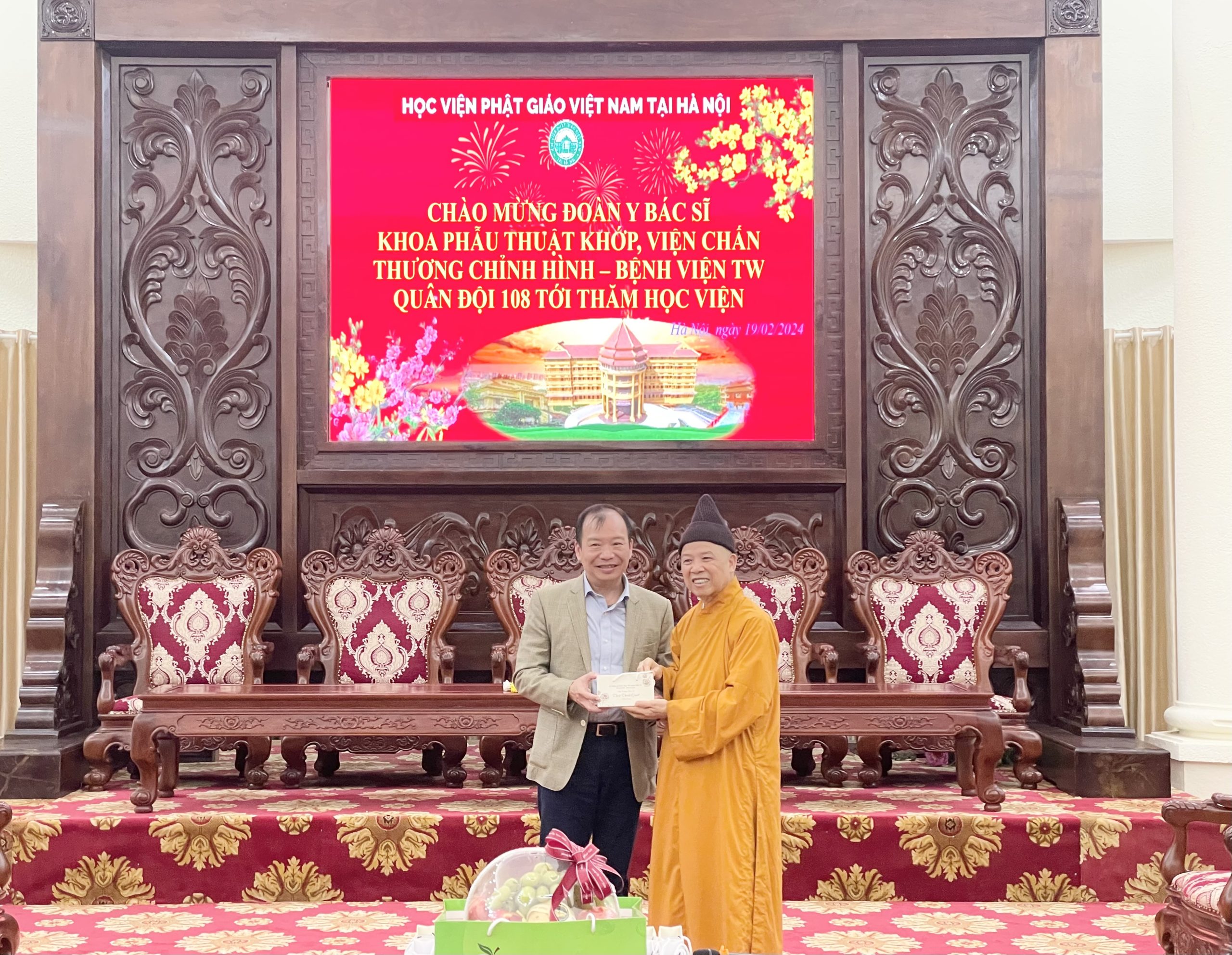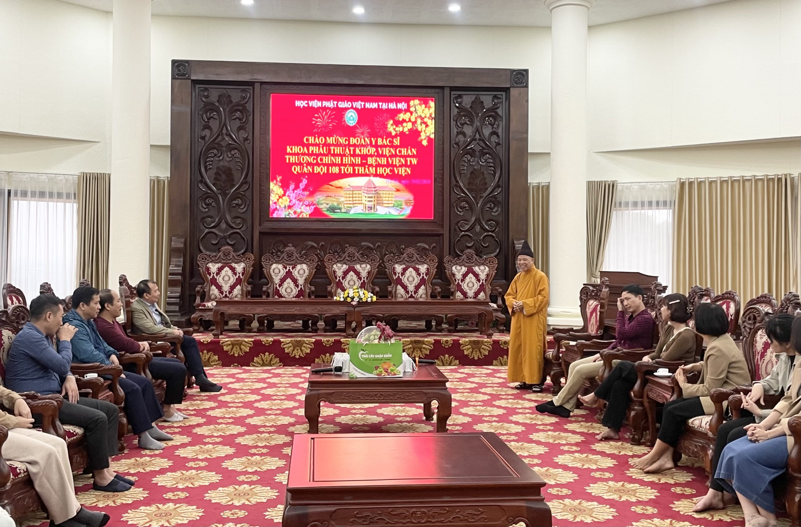 Nhân dịp đầu xuân Giáp Thìn 2024, chiều ngày mùng 10 tháng 01 năm Giáp Thìn, đoàn cán bộ Y Bác Sĩ Khoa Phẫu Thuật Khớp, Viện Chấn thương chỉnh hình – Bệnh viện TW Quân Đội 108 tới thăm Học viện Phật giáo Việt Nam tại Hà Nội.