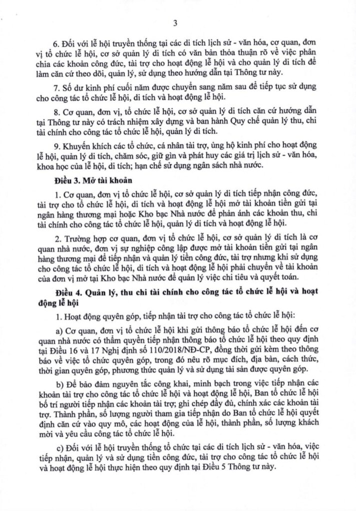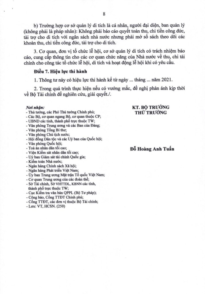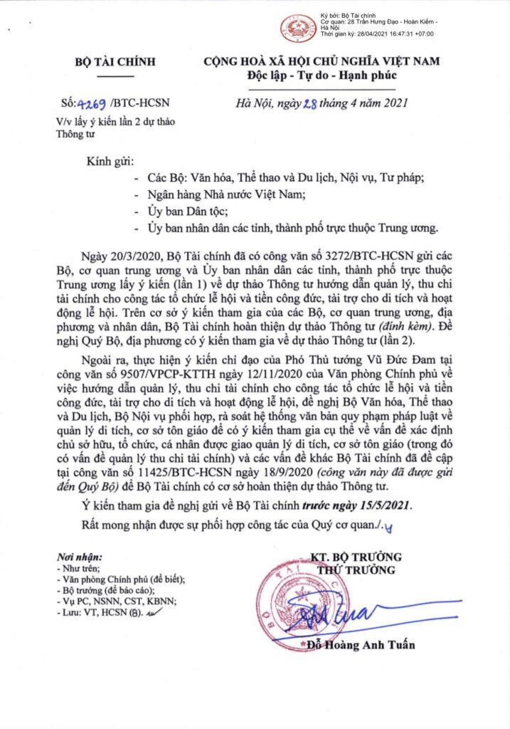 Sau hơn một năm lấy ý kiến về quản lý tiền công đức, ngày 28/4, Bộ Tài chính lại có Văn bản số 4289/BTC-HCSN về việc lấy ý kiến lần 02 dự thảo Thông tư hướng dẫn quản lý, thu chi tài chính cho công tác tổ chức lễ hội và tiền công đức, tài trợ cho di tích và hoạt động lễ hội.