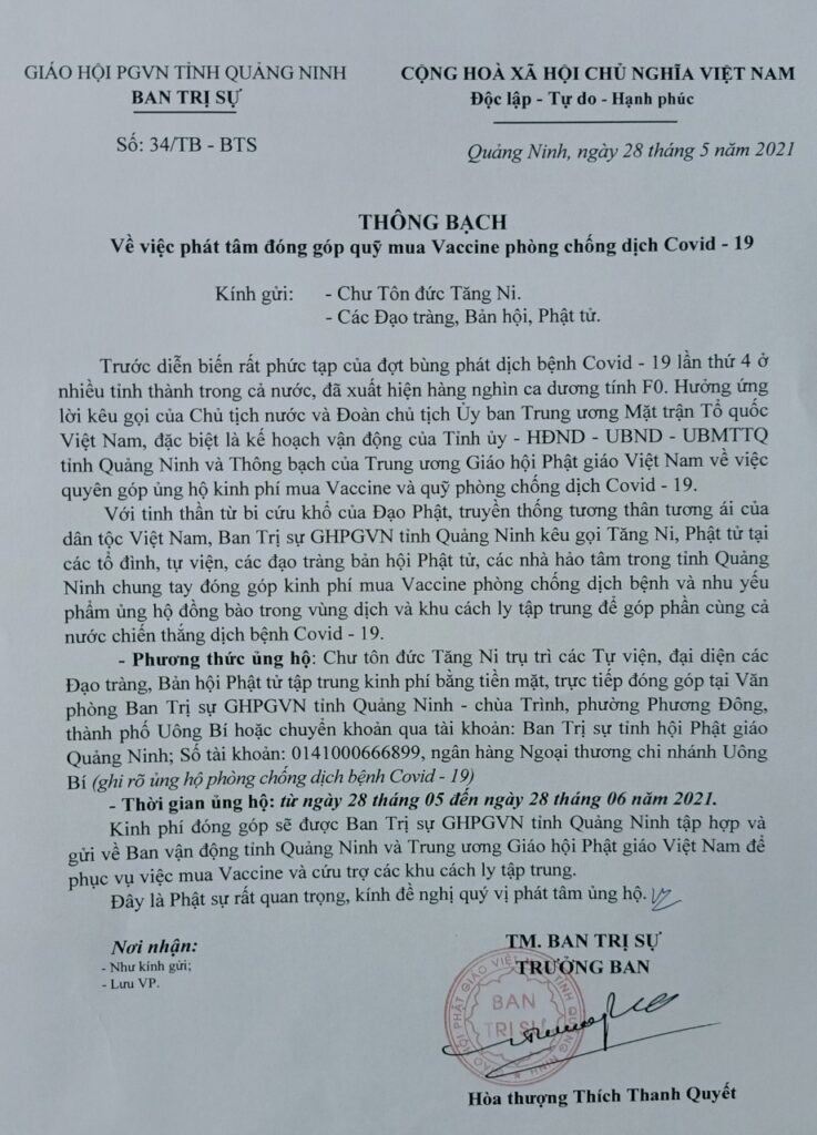 Ngày 28/5/2021, Hòa thượng Thích Thanh Quyết – Phó Chủ tịch Giáo hội Phật giáo VN, Trưởng ban Trị sự Giáo hội Phật giáo tỉnh Quảng Ninh đã ký Thông bạch số 34/TB-BTS gửi đến chư Tôn đức, Tăng Ni, các Đạo tràng , Bản hội, Phật tử trên toàn tỉnh, về việc phát tâm đóng góp quỹ mua Vaccine phòng, chống dịch Covid-19.