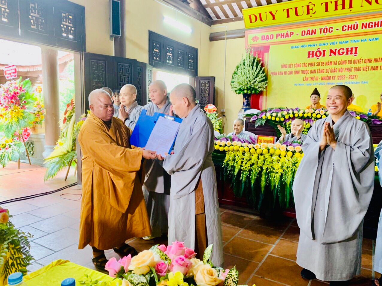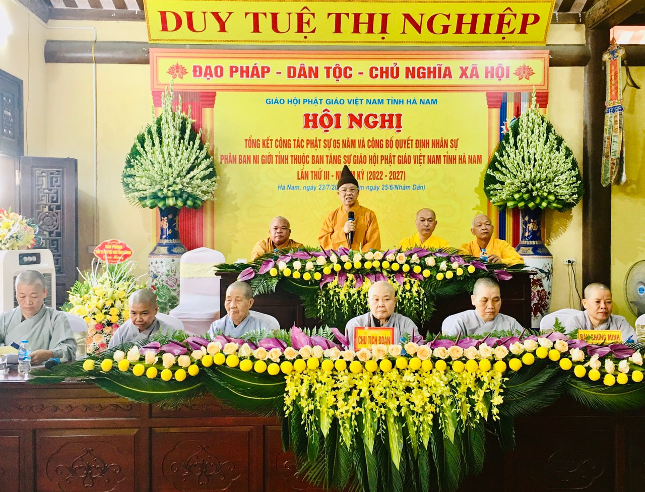 Tại buổi lễ, tôn thể chư Ni đã trang nghiêm lắng tâm nghe lời đạo từ của Hòa thượng, thay mặt BTS GHPGVN tỉnh Hà Nam, Hòa thượng tán thán công đức qua các thành tựu mà Phân ban đã thực hiện tốt đẹp các hoạt động Phật sự trong nhiệm kỳ vừa qua. Đặc biệt là công tác từ thiện xã hội là thế mạnh của Ni giới ; tham dự các hội nghị, lễ hội, diễn đàn Phật giáo;… Cuối lời Hòa thượng mong Phân ban Ni giới tiếp tục lãnh đạo Chư Ni cả trong toàn tỉnh phát triển tuệ giác, phát huy công tác từ thiền xã hội, hoằng dường chính pháp làm lợi lạc cho chúng sinh,…