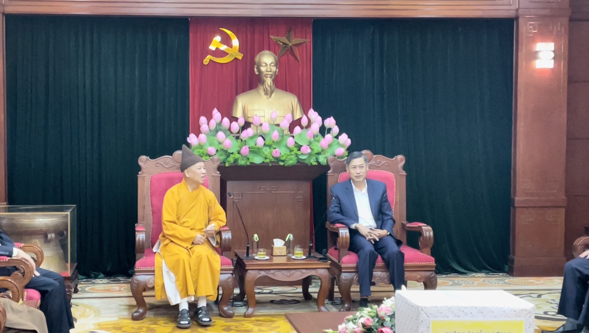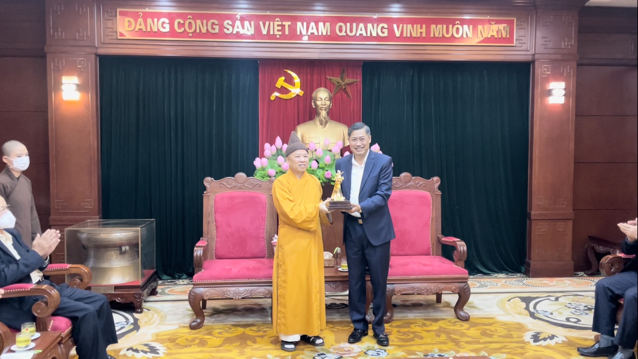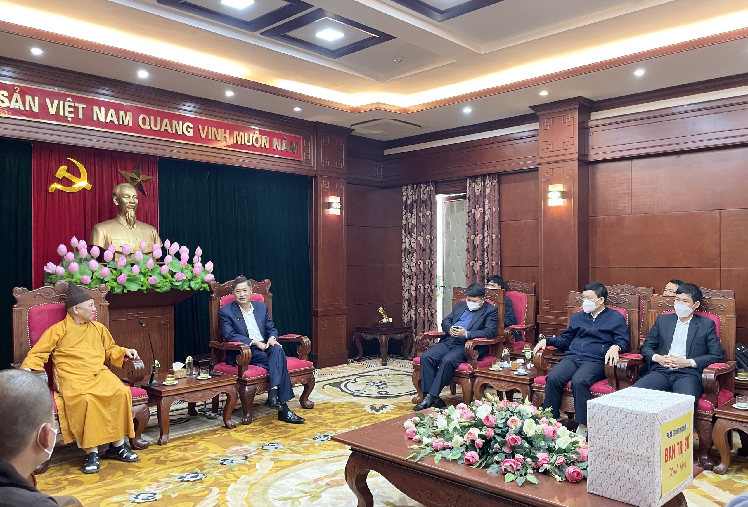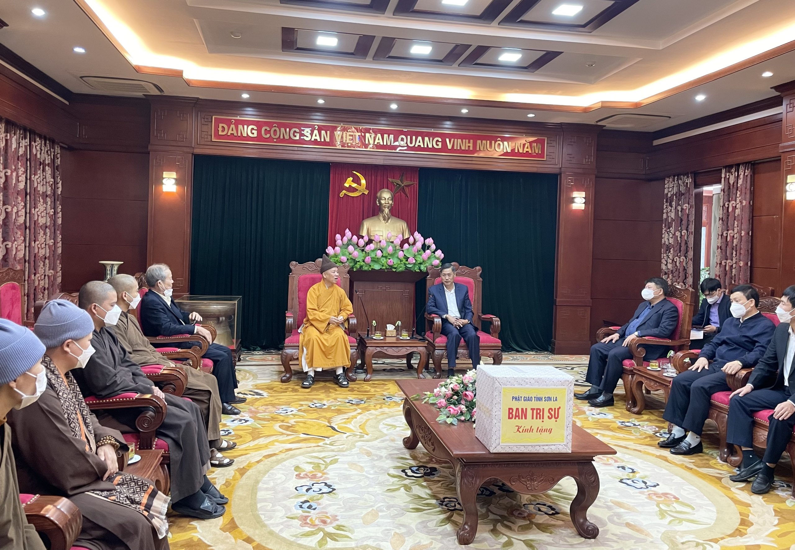 Hoà thượng gửi lời chúc mừng tới ông Bí thư Tỉnh uỷ, mặc dù Sơn La cũng là tỉnh chịu ảnh hưởng nhiều bởi dịch bệnh Covid nhưng thấy tình hình kinh tế xã hội tỉnh vẫn phát triển mạnh.
