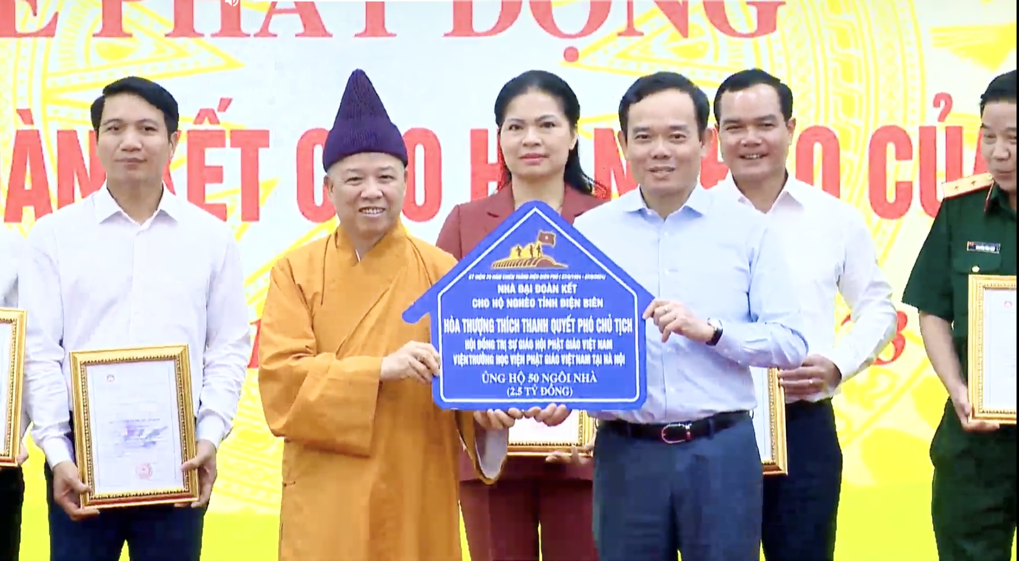Tại buổi lễ Hoà thượng Thích Thanh Quyết đại diện Ban Giáo dục Phật giáo Trung ương, Học viện Phật giáo Việt Nam tại Hà Nội cùng Ban trị sự Phật giáo 04 tỉnh Quảng Ninh, Hà Nam, Sơn La, Bắc Kạn trao số tiền 2,5 tỷ đồng xây dựng 50 căn nhà Đại đoàn kết cho những gia đình có hoàn cảnh khó khăn.