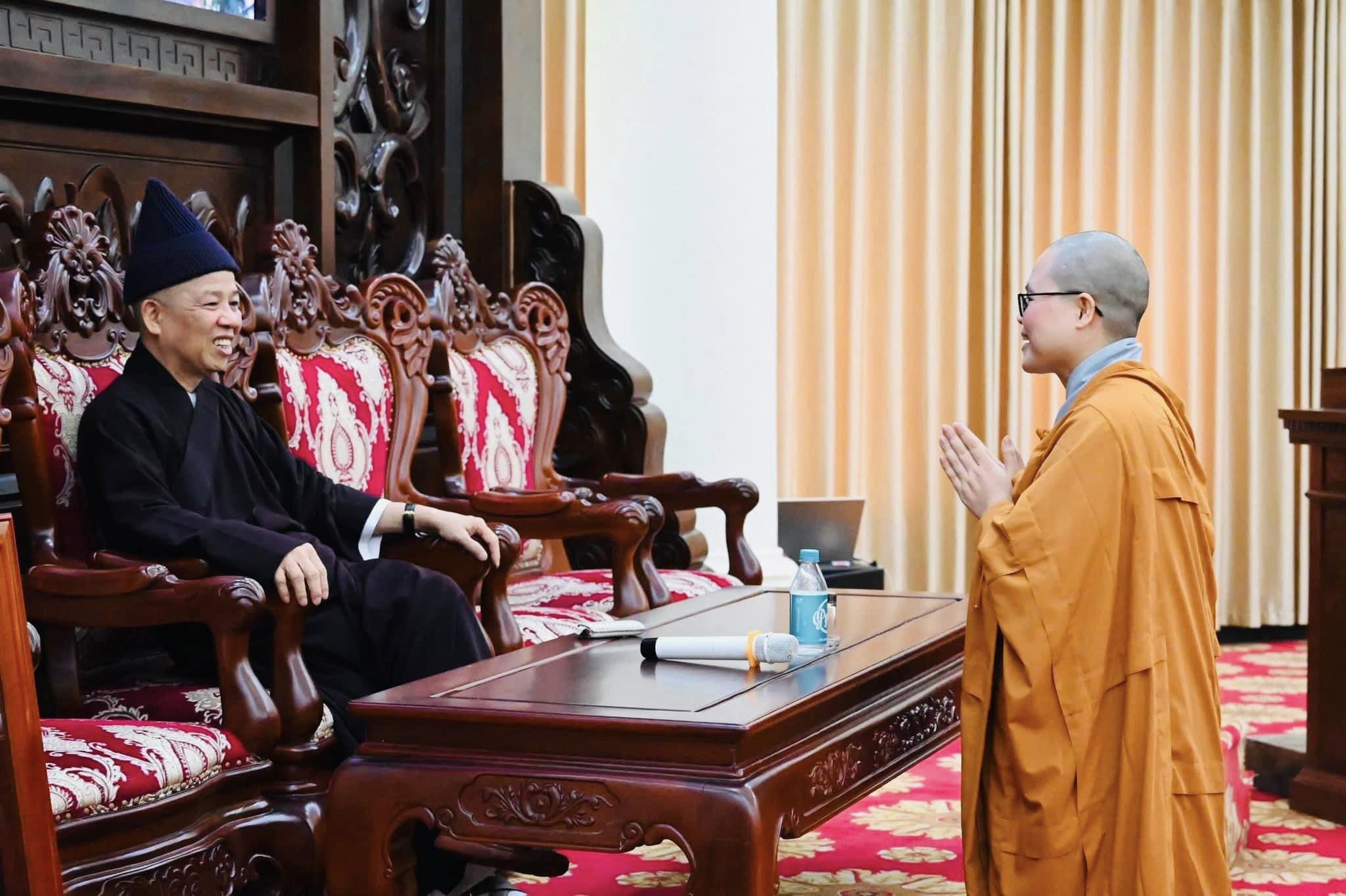 Tại buổi thăm, quý Thầy cựu Ni sinh Ni 1 đã đỉnh lễ vấn an sức khỏe Hòa thượng Viện trưởng, chư Tôn đức Hội đồng Điều hành, quý Thầy Văn phòng và gửi lời chúc tốt đẹp đến quý Thầy Cô cùng Tăng Ni sinh Học viện luôn được an lạc, cát tường, Phật sự viên thành và chúc cho công tác giảng dạy, học tập của Học viện luôn đạt nhiều thành quả tốt đẹp, viên mãn.
