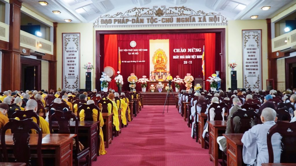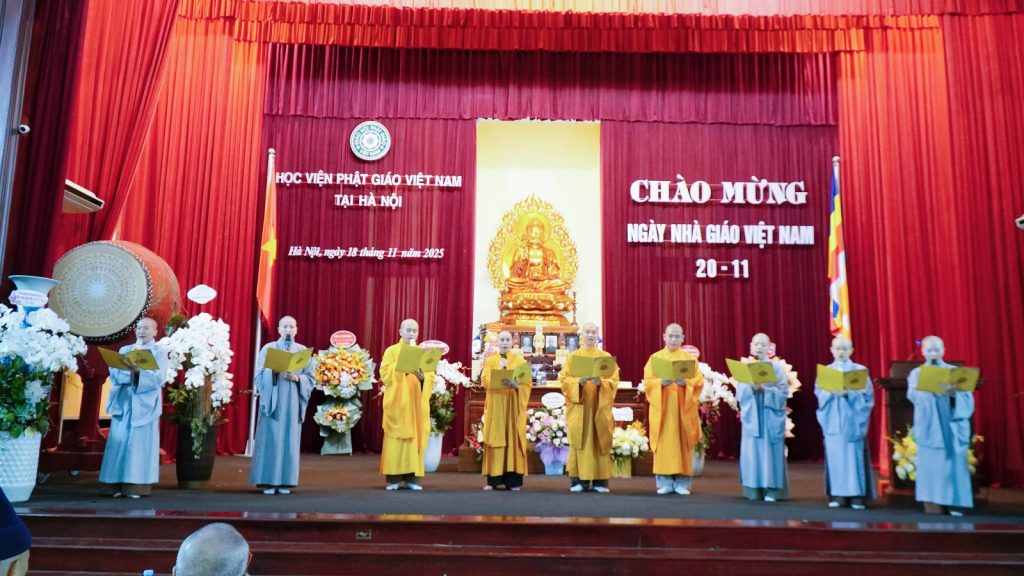 Hoà chung trong không khí tri ân của hàng triệu học sinh, sinh viên trong cả nước, hướng về những các Thầy, Cô giáo, tối ngày 18-11-2025, tại Hội trường Bảo tàng Học viện PGVN tại Hà Nội đã trang nghiêm tổ chức kỷ niệm 43 năm ngày Nhà giáo Việt Nam. Đây là nét đẹp tri ân và báo ân của hơn 500 Tăng Ni đang học tại Học viện tri ân chư tôn đức Hội đồng Điều hành, Văn phòng, quý Giáo thụ sư, giảng sư của Học viện. Quý Ngài là “những người lái đò thầm lặng”, dẫn dắt các thế hệ Tăng Ni trên hành trình tu tập giác ngộ, tự lợi, lợi tha.