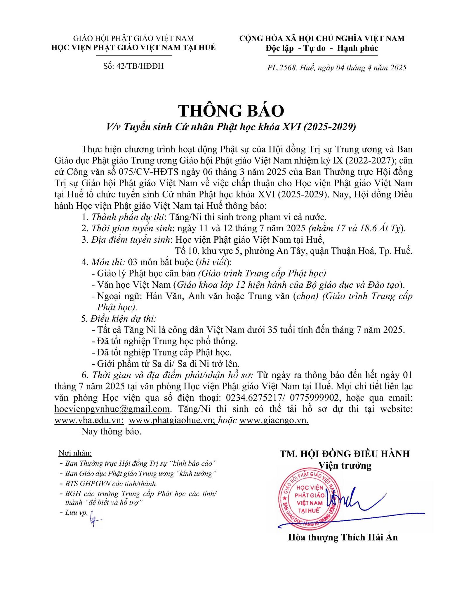 Học viện PGVN tại Huế: Thông báo tuyển sinh Cử nhân Phật học khóa XVI (2025-2029)