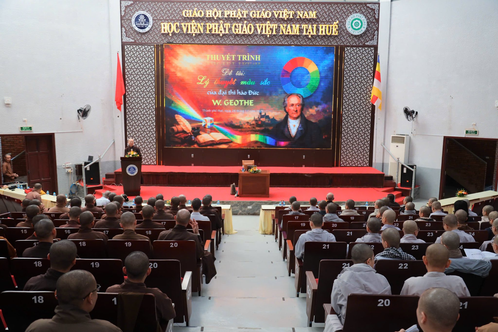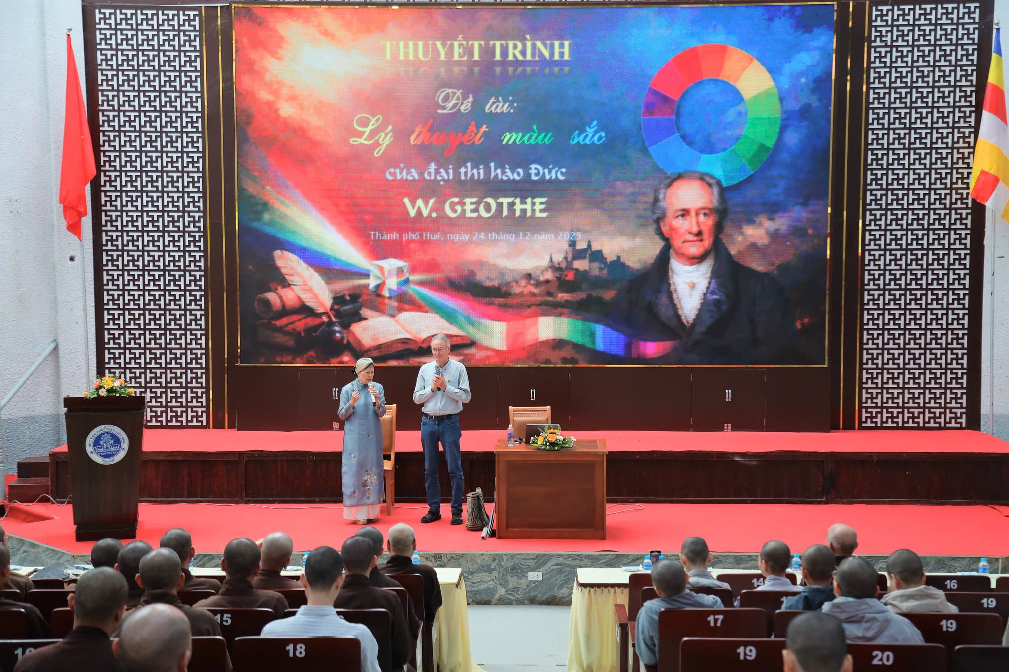 Sáng ngày 24/12/2025, tại Hội trường Hoa Sen – Học viện Phật giáo Việt Nam tại Huế, Hội đồng Điều hành Học viện đã đón tiếp Tiến sĩ Thomas Wildgruber – Học giả người Đức, nhà sư phạm, nhà nghiên cứu về triết học, lịch sử văn hóa và giáo dục nghệ thuật đến chia sẻ đề tài “LÝ THUYẾT MÀU SẮC CỦA ĐẠI THI HÀO ĐỨC W.GEOTHE”; tham gia diễn thuyết còn có Giáo sư Thái Kim Lan – Tiến sĩ Triết học Đức, Giảng viên Học viện PGVN tại Huế, với kinh nghiệm hơn 30 năm giảng dạy và nghiên cứu tại Đại học Ludwig Maximilian (Munich, CHLB Đức).