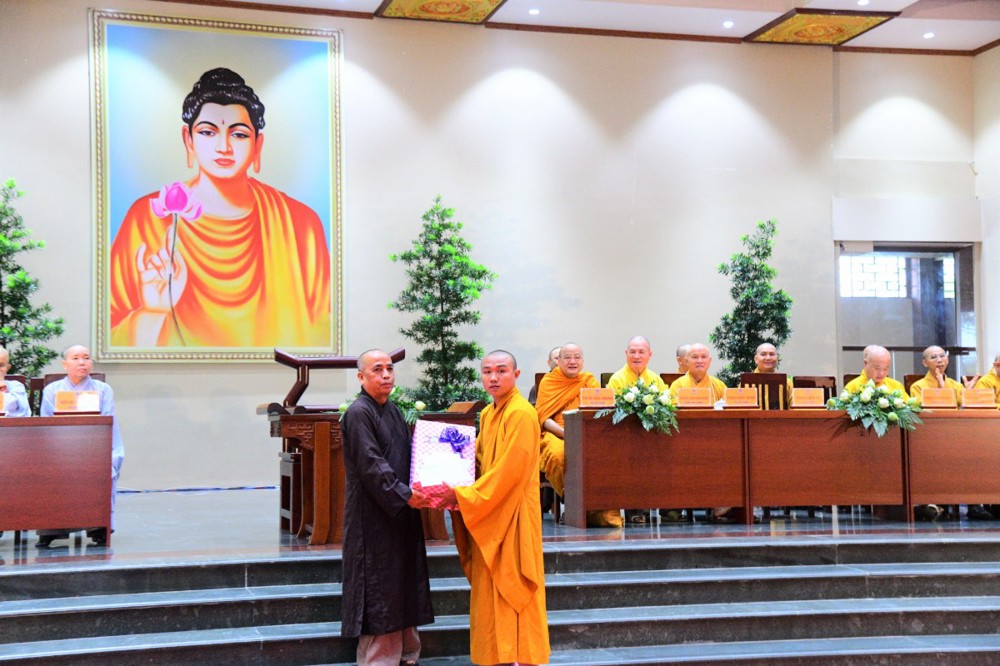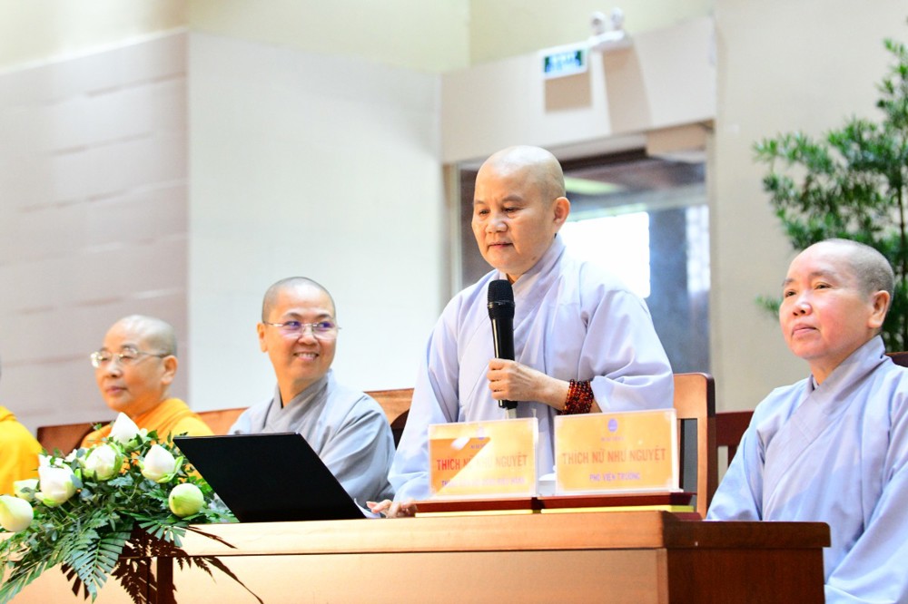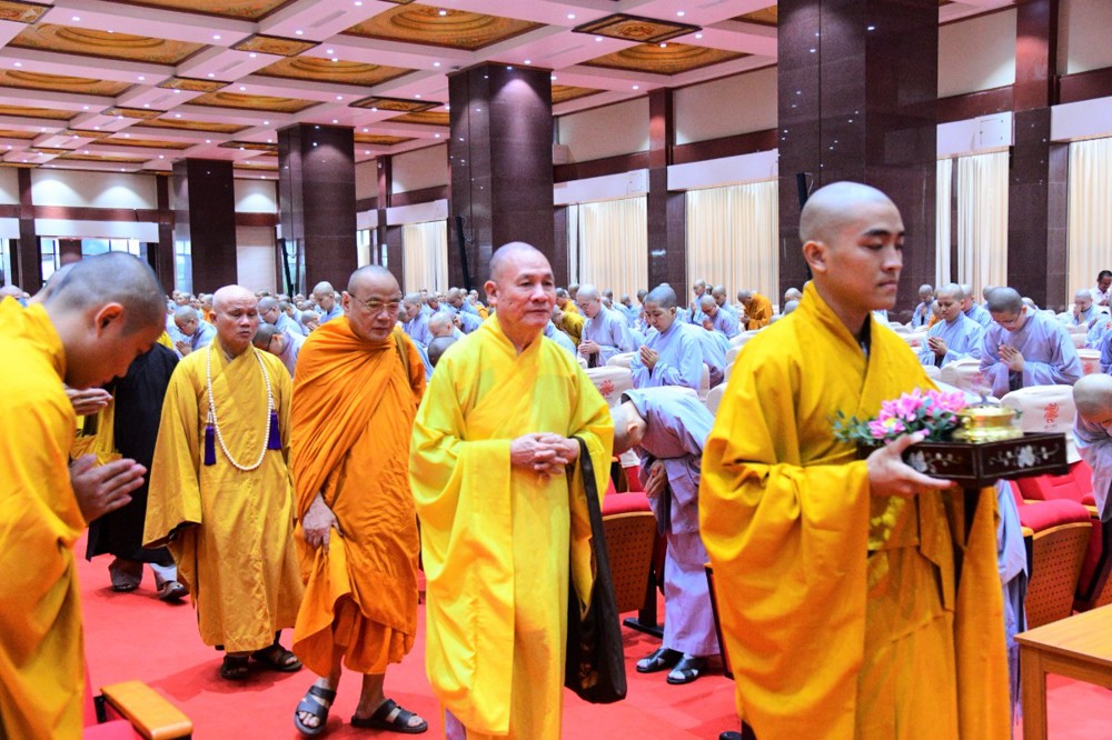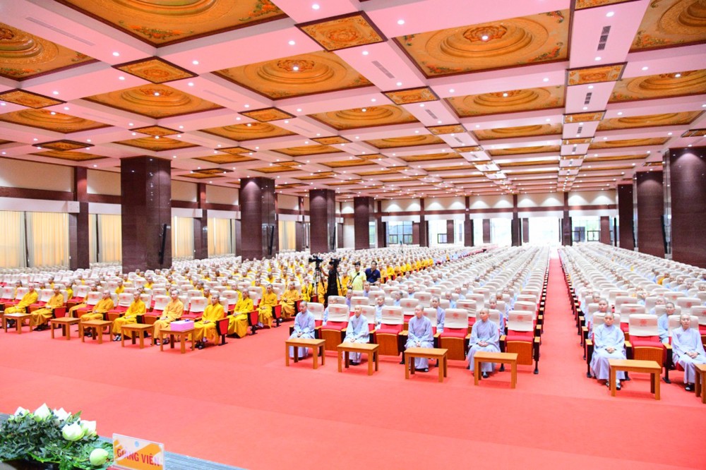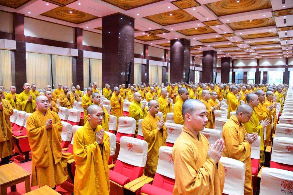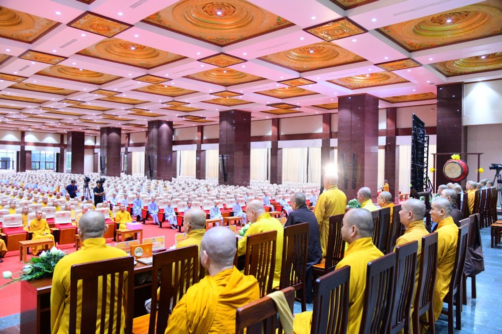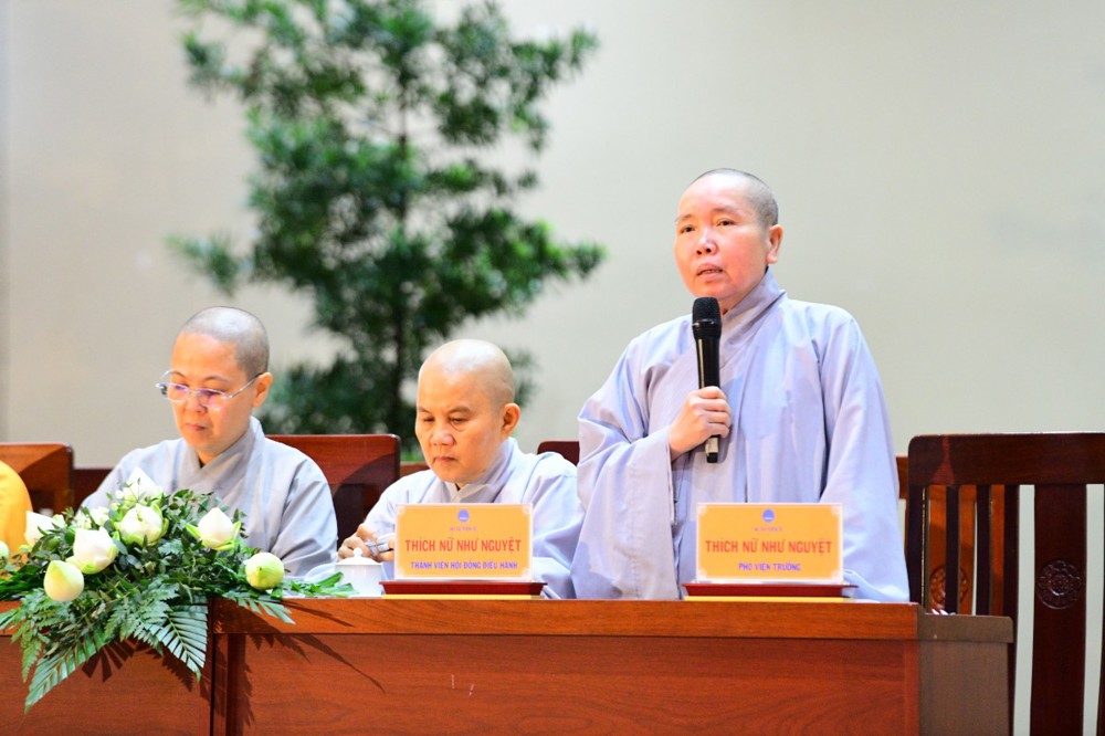 Tại đây, đại diện Hội đồng Điều hành đã báo cáo kết quả tuyển sinh hệ cử nhân, nhập học nội trú và làm quen với thời khoá tu học của các tân Tăng Ni sinh khoá XX với 221 vị.