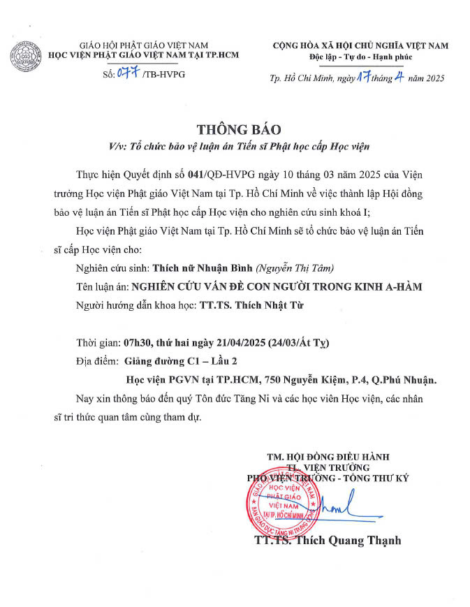 Học viện PGVN tại TP HCM: Thông báo tổ chức bảo vệ luận án Tiến sĩ Phật học cấp Học viên