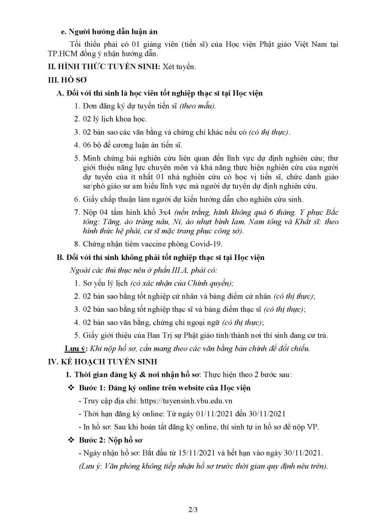 Học viện Phật giáo Việt Nam tại TP.HCM (viết tắt là Học viện) trân trọng thông báo tuyển sinh tiến sĩ Phật học khóa III năm 2022 với nội dung như sau: