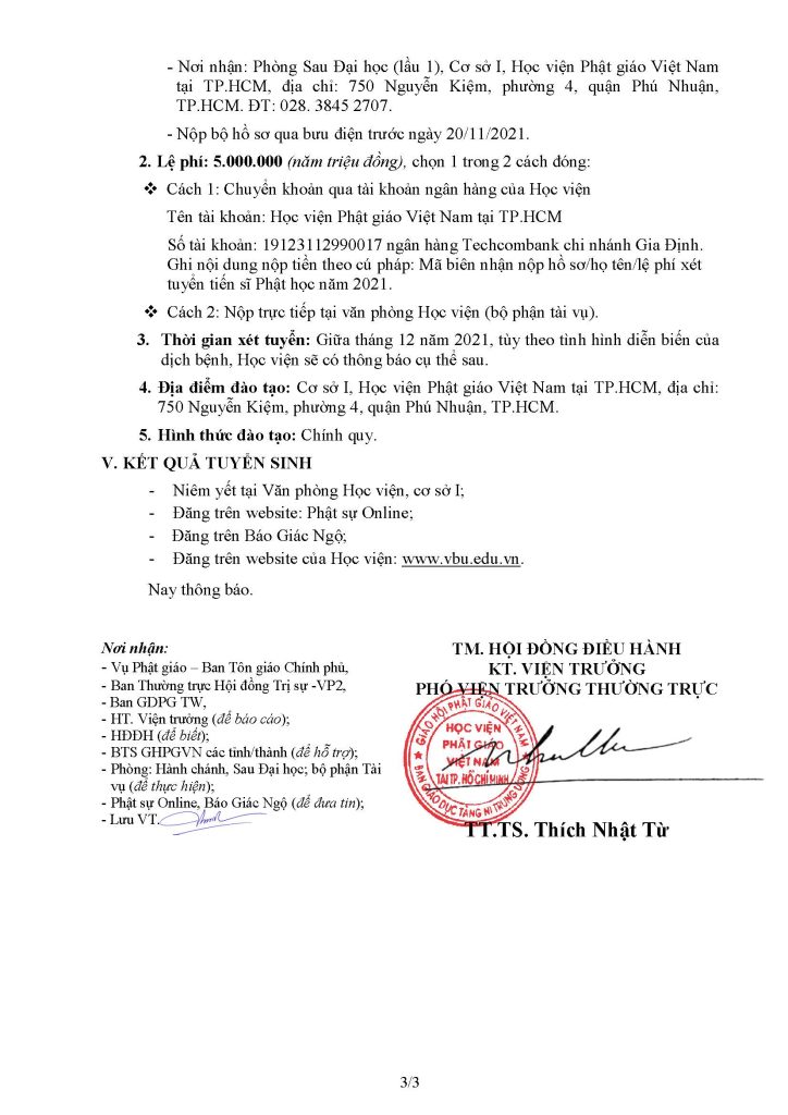– Nơi nhận: Phòng Sau Đại học (lầu 1), Cơ sở I, Học viện Phật giáo Việt Nam tại TP.HCM, địa chỉ: 750 Nguyễn Kiệm, phường 4, quận Phú Nhuận, TP.HCM. ĐT: 028. 3845 2707.