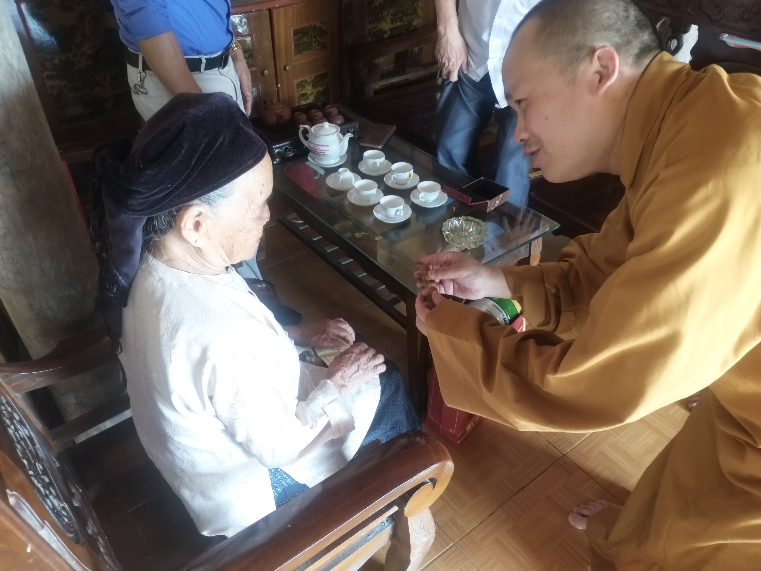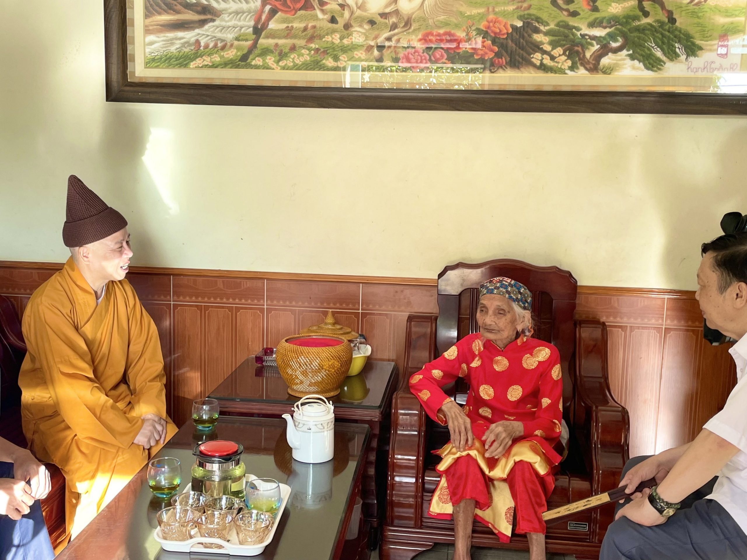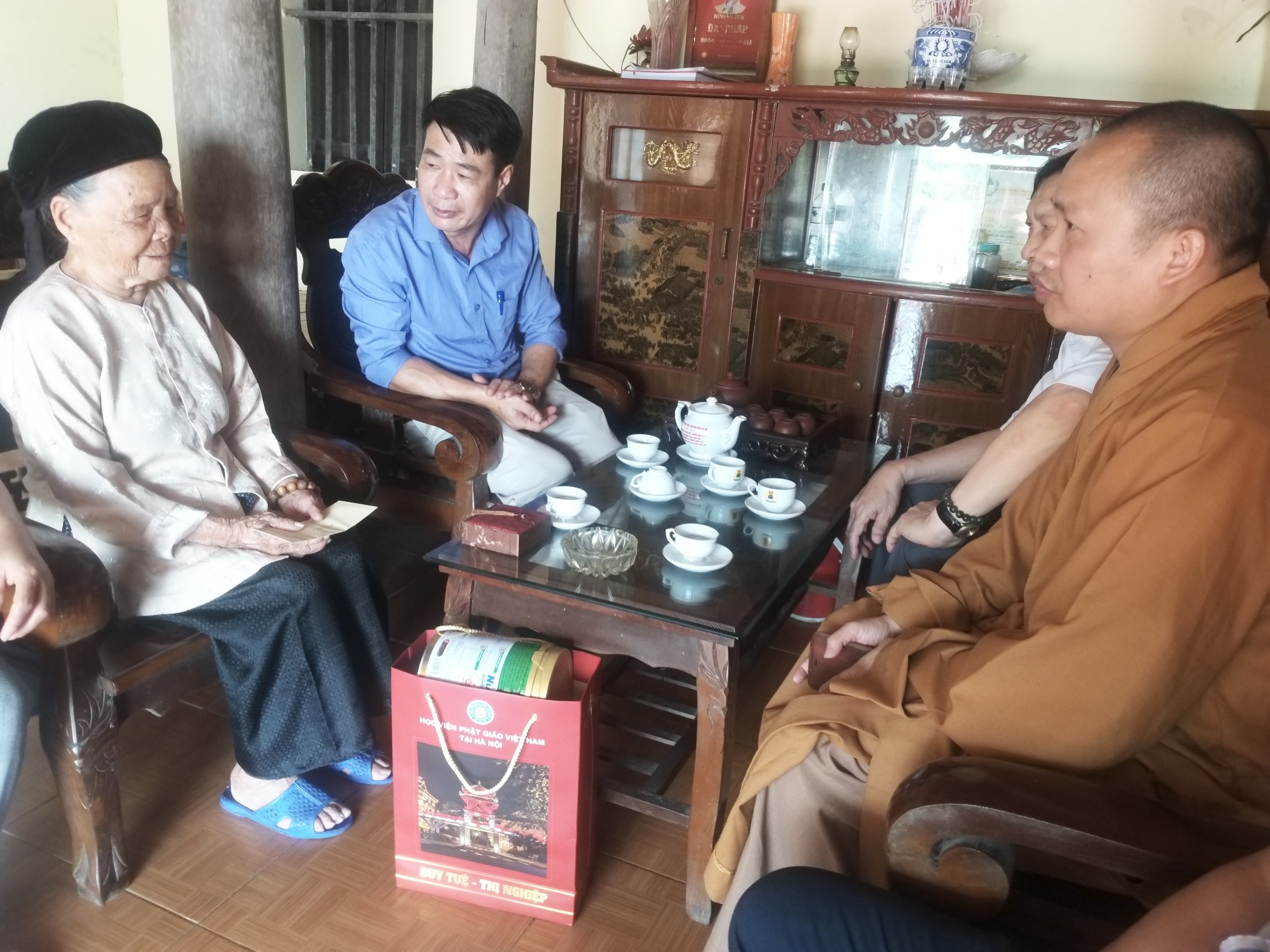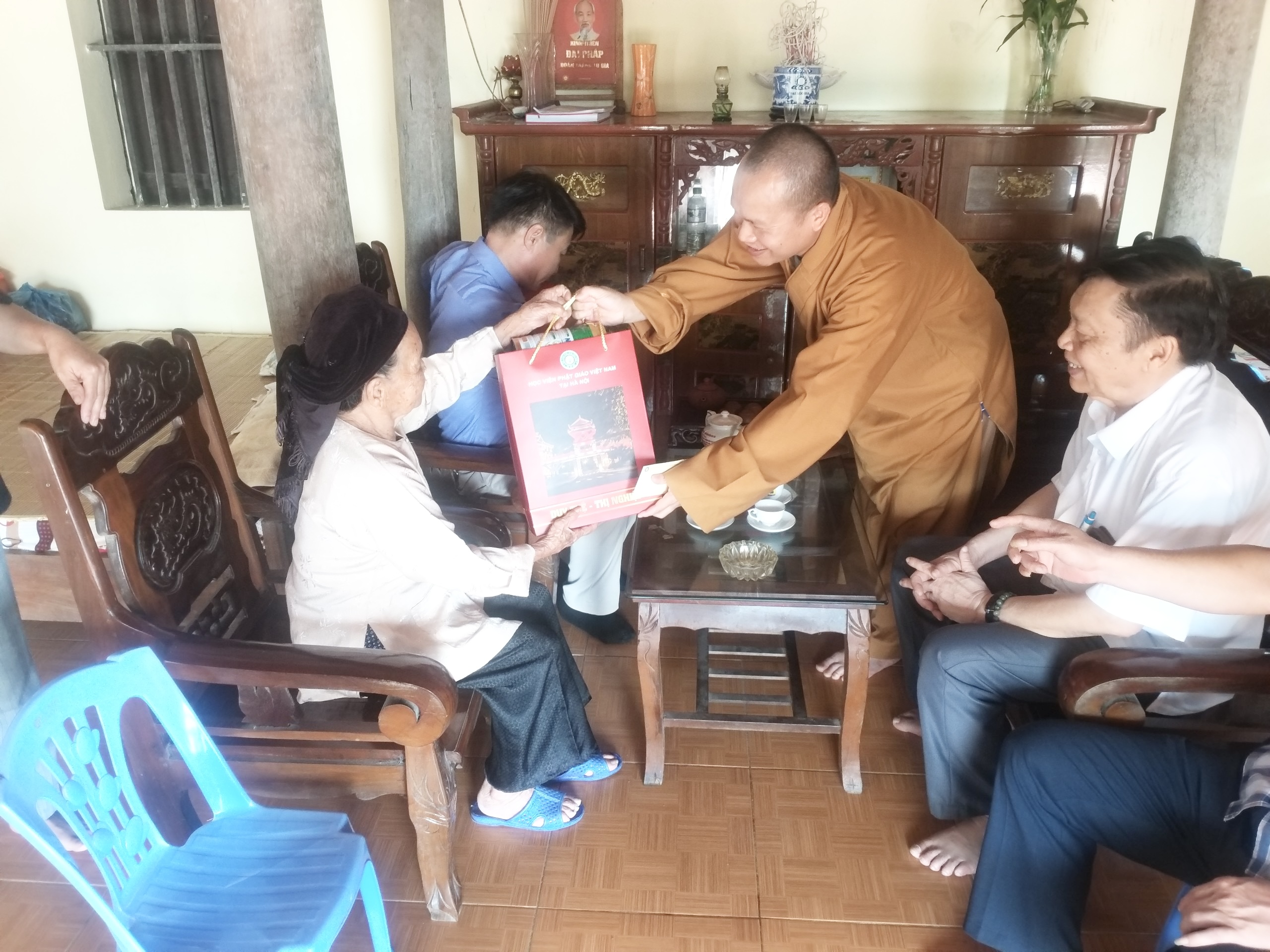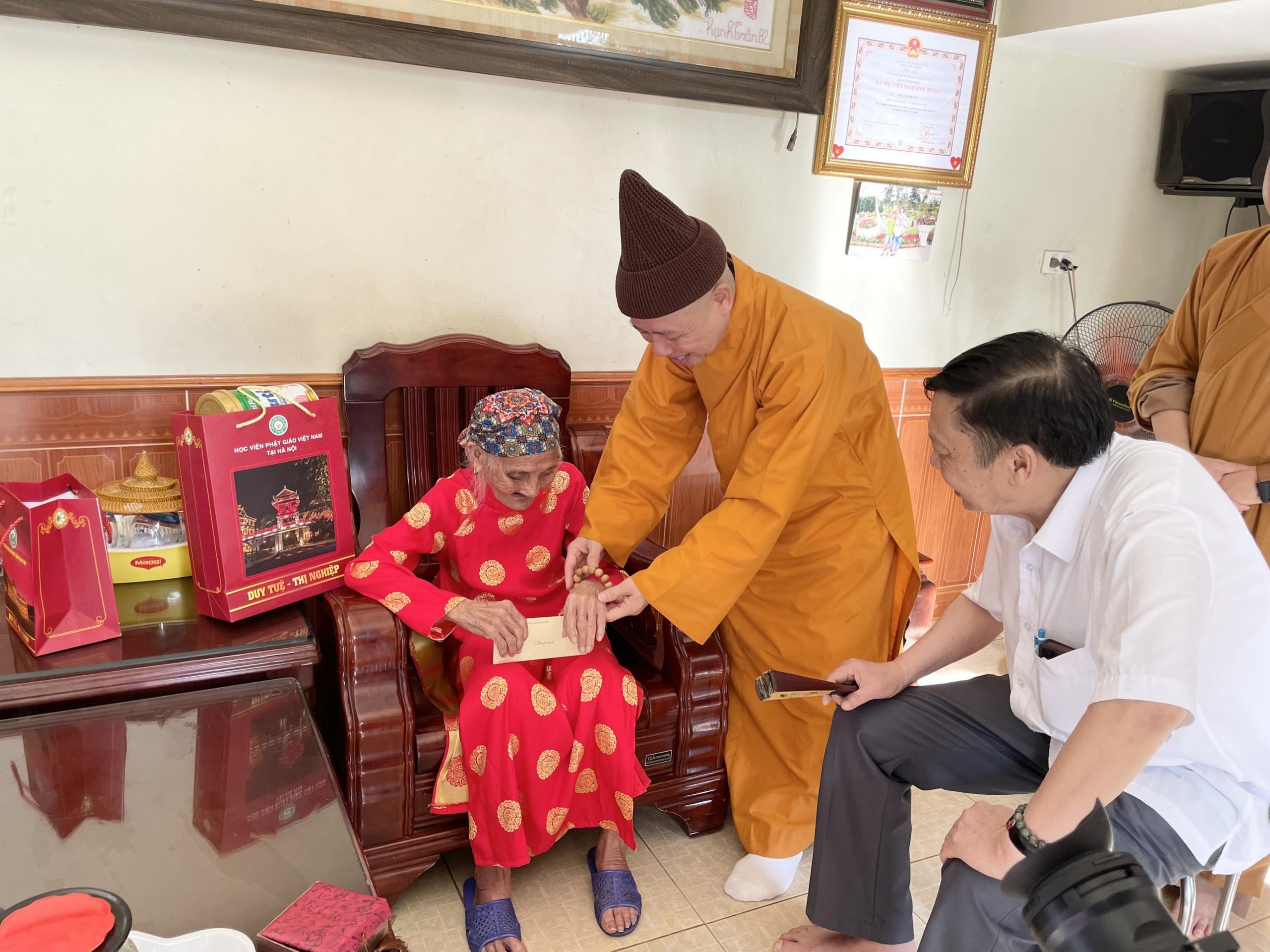 Tại đây, Hoà thượng cùng đoàn đã ân cần thăm hỏi sức khỏe, điều kiện sống, sinh hoạt thường ngày của các cụ. Bày tỏ sự tri ân sâu sắc trước những hy sinh to lớn của các cụ, đã cống hiến vì độc lập, tự do cho Tổ quốc.