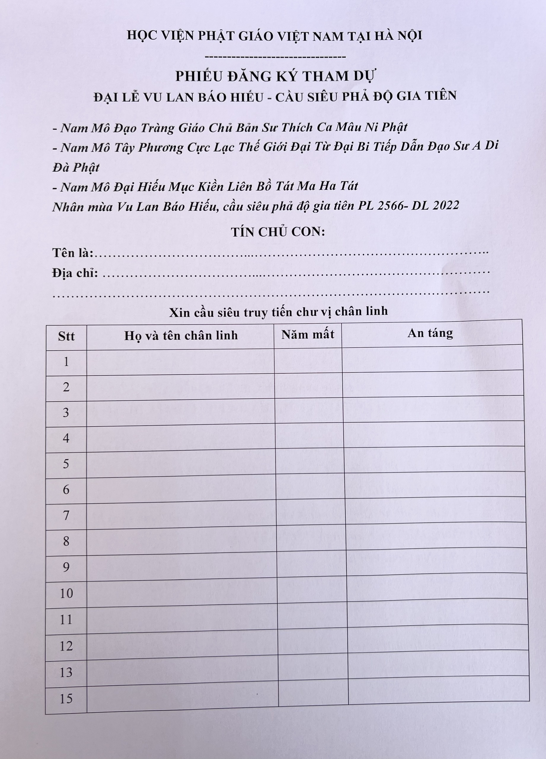– Các Phật tử đăng ký danh sách theo mẫu của Học viện hoặc viết theo mẫu bên dưới, rồi gửi trực tiếp hoặc qua địa chỉ Email, zalo về Văn phòng Học viện trước ngày 9/7/Nhâm Dần.