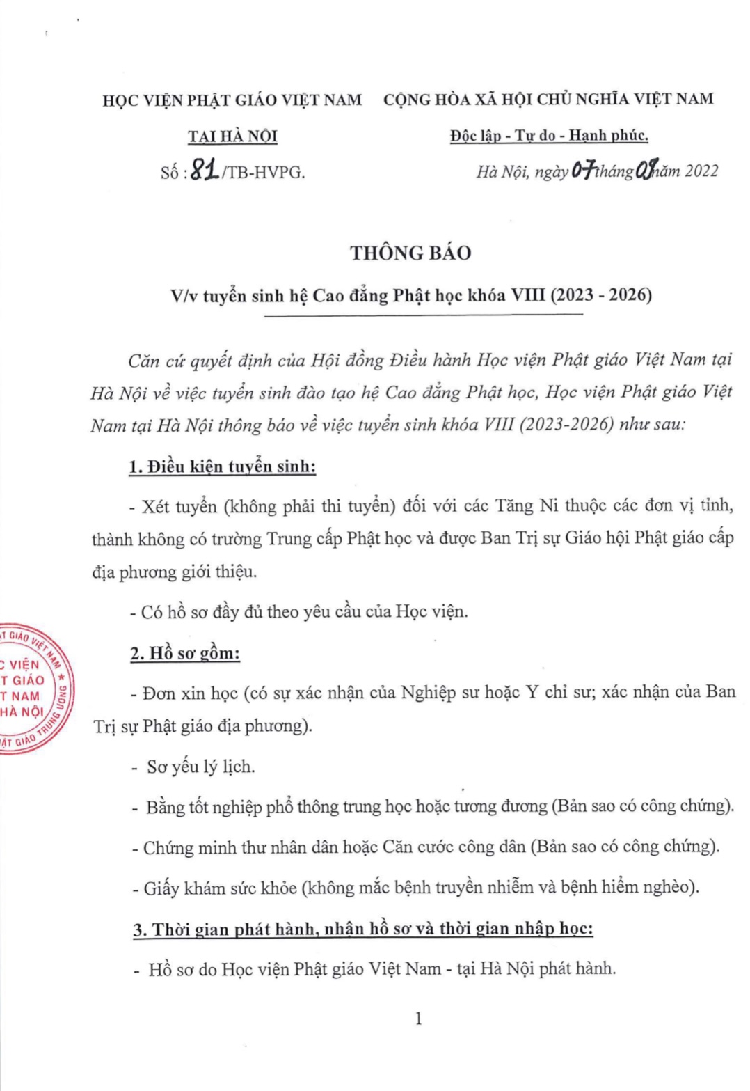Theo đó, căn cứ quyết định của Hội đồng Điều hành Học viện Phật giáo Việt Nam tại Hà Nội về việc tuyển sinh đào tạo hệ Cao đẳng Phật học, Học viện Phật giáo Việt Nam tại Hà Nội thông báo về việc tuyển sinh khóa VIII (2023-2026) như sau: