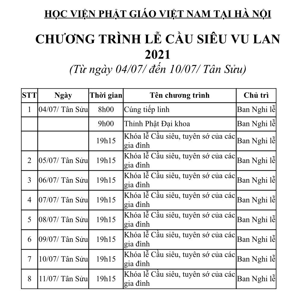 Đại lễ Vu lan năm nay diễn ra trong bối cảnh dịch bệnh rất phức tạp ở khắp các tỉnh thành. Hưởng ứng lời kêu gọi của Trung ương Giáo hội Phật giáo Việt Nam, Học viện Phật giáo VN tại Hà Nội sẽ trang nghiêm tổ chức lễ Cầu siêu Vu lan theo hình thức tuyến, với sự tham dự của chư Tôn đức Hội đồng Điều hành cùng 500 Tăng Ni sinh hiện đang cấm túc trong Học viện từ 16/3 AL đến nay để phòng chống dịch bệnh.