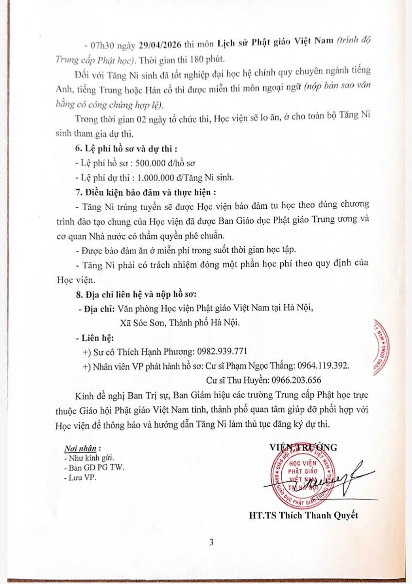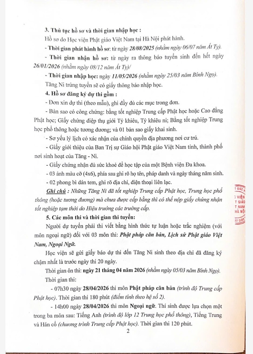 – Thời gian nhập học: ngày 11/05/2026 (nhằm ngày 25/03 năm Bính Ngọ). Tăng Ni trúng tuyển sẽ có giấy thông báo nhập học.