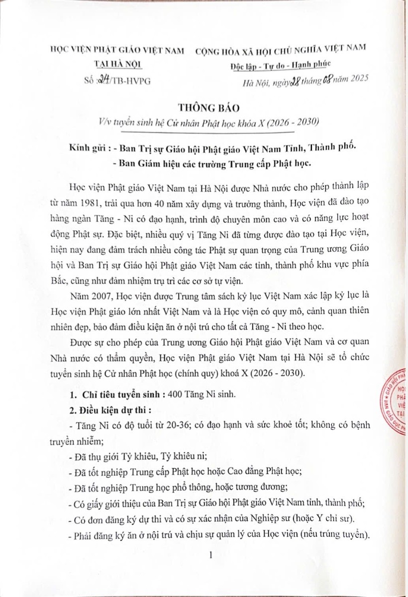 Được sự cho phép của Trung ương Giáo hội Phật giáo Việt Nam và cơ quan Nhà nước có thẩm quyền, Học viện Phật giáo Việt Nam tại Hà Nội sẽ tổ chức tuyển sinh hệ Cử nhân Phật học (chính quy) khoá X (2026 – 2030).