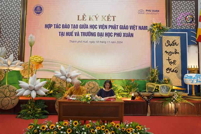 Tại buổi lễ trang trọng này, Học viện PGVN tại Huế và Trường Đại học Phú Xuân đã thực hiện ký kết hợp tác toàn diện về đào tạo song bằng, đào tạo văn bằng 2 và đào tạo chứng chỉ nghiệp vụ ngắn hạn.