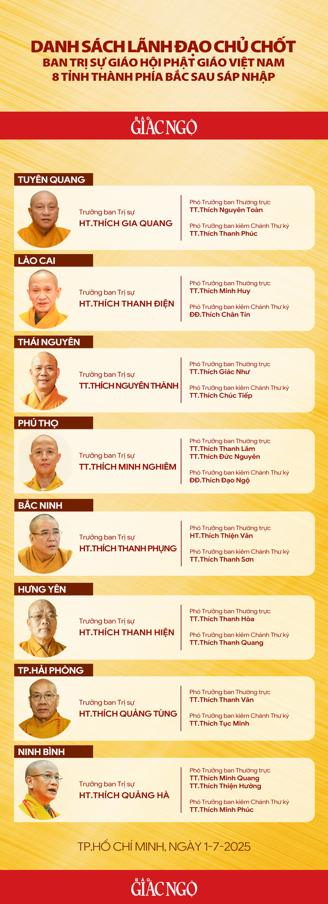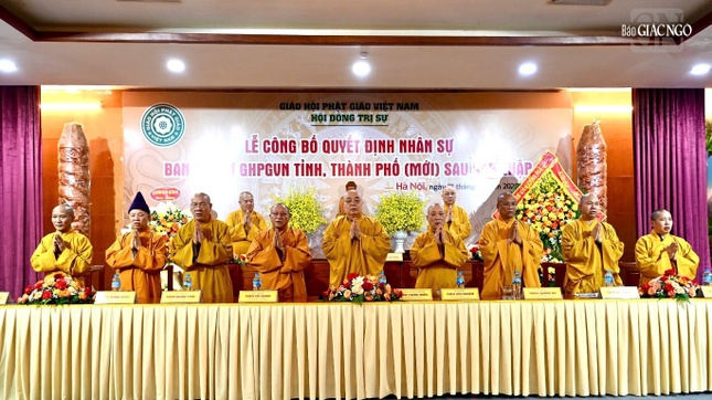 Hội nghị công bố danh sách nhân sự chủ chốt do Ban Thường trực Hội đồng Trị sự GHPGVN chỉ định và công cử hôm qua, 30-6, tại TP.HCM dành cho 15 tỉnh, thành phố phía Nam sau sáp nhập và hợp nhất; tại hội nghị chiều nay diễn ra ở Hà Nội tiếp tục công bố danh sách lãnh đạo chủ chốt của 8 Ban Trị sự GHPGVN mới được chỉ định, cụ thể: