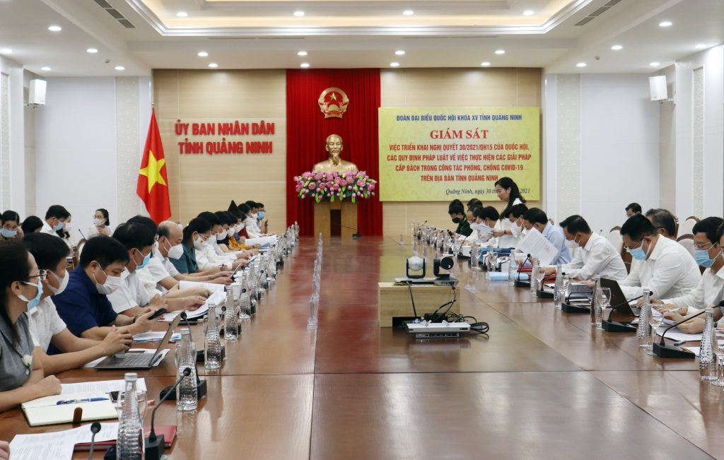 Đoàn đã nghe báo cáo công tác triển khai Nghị quyết của Quốc hội, các quy định pháp luật về thực hiện các giải pháp cấp bách trong công tác phòng, chống dịch Covid-19, 9 tháng đầu năm 2021 trên địa bàn tỉnh Quảng Ninh. Ghi nhận và đánh giá cao công tác áp dụng luật vào thực tiễn, đồng thời các Đại biểu cũng cho ý kiến thêm về một số giải pháp trong công tác phòng, chống dịch Covid-19.