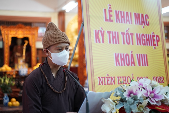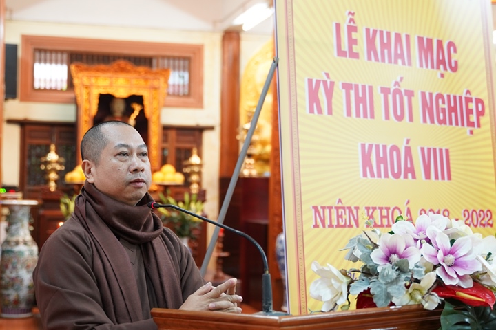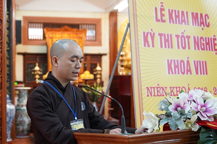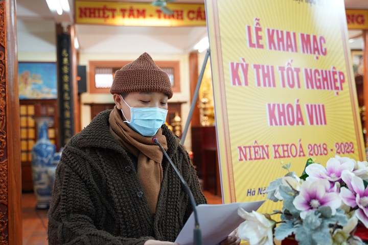 Phát biểu khai mạc, TT. Thích Minh Tín đã nhấn mạnh “Việc tốt nghiệp hôm nay chỉ là để kết thúc một quá trình tu học. Đối với người tu sĩ, sự nghiệp tu học là cả đời. Tuy nhiên, đối với những vị Tăng Ni sinh không có điều kiện để tiếp tục học lên thêm, thì kết quả tốt nghiệp cũng như những kiến thức Phật học thu hoạch được trong 4 năm qua cũng chính là tư lương cho việc tu, và các hoạt động Phật sự sau này của mỗi người. Còn đối với những vị có điều kiện tu học tiếp, kết quả tốt nghiệp hôm nay chính là cơ sở, tiêu chí để các vị tiếp tục dự những kì thi tiếp theo. Kết quả tốt nghiệp chính là để báo đáp, tri ân những công đức của Thầy tổ, chư Tôn đức lãnh đạo GHPGVN Tp. Hà Nội các quận huyện thị, các quý Thầy cô quản lý và giảng dạy của nhà trường, cũng như là sự báo đáp hồi hướng tới các thiện hữu Phật tử đã phát tâm hỷ cúng bảo trợ cho Thầy trò nhà trường trong suốt 4 năm qua“. Thượng tọa đã động viên, khích lệ 121 vị Tăng Ni sinh giữ vững tinh thần, cường ký ức, an trú tâm, vận dụng trí tuệ, quán chiếu để làm tốt bài thi. Đồng thời, Thượng tọa cũng mong quý thầy cô trong Ban giám thị hãy thực hiện tốt quy chế, nội quy đã ban hành để kết quả tốt nghiệp phản ánh được trung thực, khách quan.