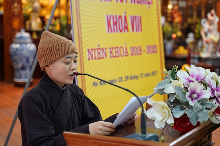 Tại đây, Tăng sinh Thích Giác Nguyên đã đại diện cho Tăng ni sinh khóa VIII phát biểu bày tỏ lòng tri ân đến chư Tôn đức trong Ban giám hiệu, Thượng tọa trụ trì chùa Đại Từ Ân đã tận tình chỉ dạy, tạo điều kiện cho các Tăng Ni sinh có được môi trường học tập tốt nhất và gặt hái được nhiều bài học ý nghĩa nhất làm hành trang trên bước đường phụng sự “lợi Đạo – ích Đời”.