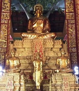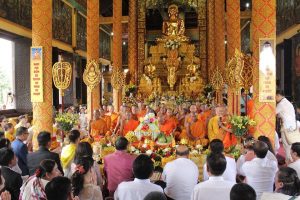 Bên ngoài của chính điện thường có các công trình phụ trợ, các trang trí phù điêu đắp nổi, thể hiện các hình tượng tiên nữ xinh đẹp, chim thần Krud nâng đỡ mái chùa, chằn Yeak hung dữ, đầu thần Bayon bốn mặt… được lấy từ văn hóa tín ngưỡng dân gian của người Khmer, ngoài ra có các dãy hành lang tạo không gian thoáng mát, trang trí các hình tượng những thế lực tà ác đã bị đức Phật quy phục.