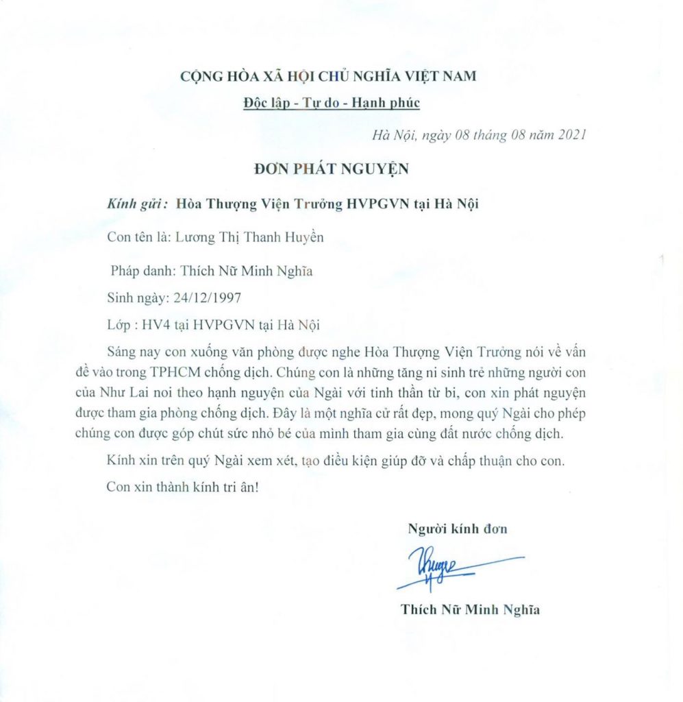 Hưởng ứng lời kêu gọi của Trung ương Giáo hội, các Tăng Ni trẻ tại Học viện Phật giáo Việt Nam tại Hà Nội hăng hái làm đơn phát nguyện tham gia nơi tuyến đầu chống dịch.