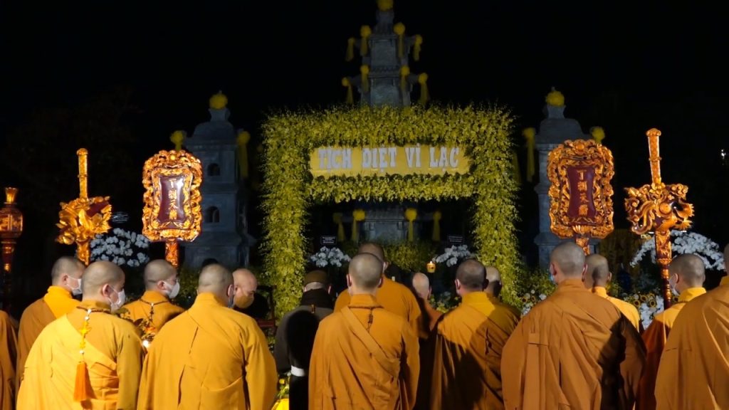 Sau thời tụng kinh Di Giáo, tăng chúng trang nghiêm nhiễu quanh Cụ và niệm Phật Di Đà.