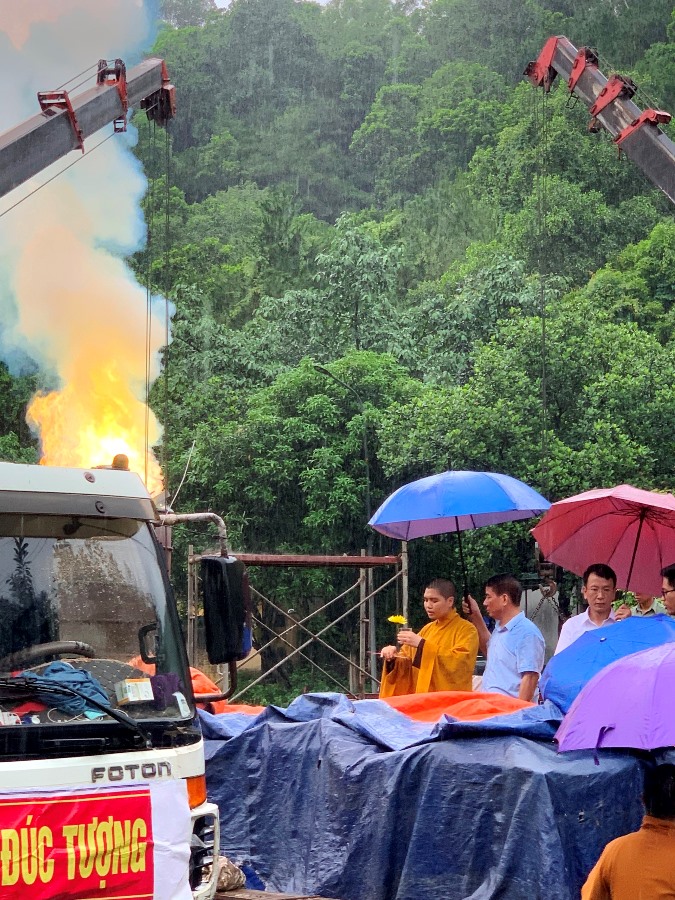 Buổi lễ hôm nay tiến hành rót đồng đúc 8 pho tượng gồm: Tượng Phật Di Đà, Bồ tát Quán Âm, Bồ tát Thế Chí, Đức Phật Thích Ca, Bồ Tát Văn Thù, Bồ tát Phổ Hiền, tượng Phạm Thiên và Đế Thích. Sau ngày hôm nay sẽ tiếp tục rót đồng đúc tượng Cửu Long tại cơ sở của đơn vị thi công đúc tượng. Tổng kinh phí đúc 9 pho tượng khoảng hơn 1 tỉ đồng, từ nguồn vốn xã hội hóa.