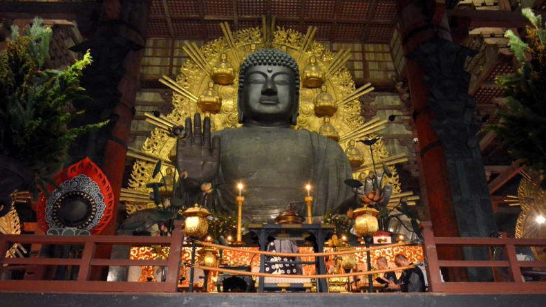 Bức tượng Phật bằng đồng khổng lồ và Đại Phật Điện hiện nay có niên đại đầu thế kỷ XVIII, theo sát kiến trúc, kiểu thức nguyên gốc. Đại Nhật Phật (Vairochana) được người Nhật gọi là Đại Nhật Như Lai (Dainichi Nyorai). Vua Shomu cho dựng tượng Đại Nhật Phật bằng đồng cao 16m, hoàn thành và an vị vào năm 752 dưới Triều đại Tempyo Shoho. Đại Nhật Phật được coi là đứng đầu trong Ngũ Thiền Phật, ngự ở tầng trời Vô sắc giới (Arupadhatu), được các Phật tử Nhật Bản coi là Vô thượng Phật hay Vũ trụ Phật, có hào quang vô lượng vô biên, nên gọi là Đại Nhật Phật. Vị Phật này cũng được coi là người sáng lập Chân ngôn tông (Shingon) – một hình thức Phật giáo Mật tông phổ biến ở Nhật Bản.