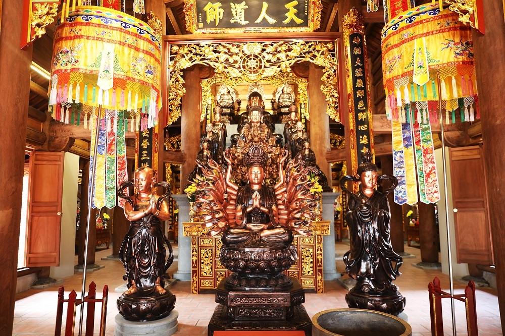 Nghệ thuật chạm khắc gỗ truyền thống của cha ông với những đường nét tinh xảo là điểm nhấn làm nên giá trị của công trình này. Bộ khung gỗ mái dạng “giá chiêng, chồng rường” và các họa tiết trang trí, tạo hình hoa sen, vân mây được cách điệu, thể hiện óc sáng tạo, sự tài hoa và tỉ mỉ trong từng chi tiết của các nghệ nhân điêu khắc làm nên công trình này.