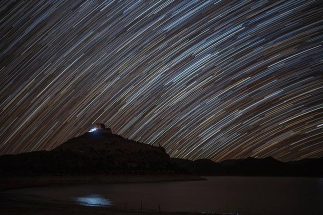 Khi màn đêm buông xuống, mặt hồ phản chiếu bầu trời đầy sao, sáng lấp lánh bao quanh ngôi đền.