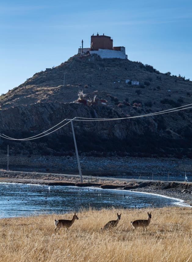 Đứng trên đỉnh của chùa, bạn có thể nhìn thấy những con linh dương Tây Tạng chạy nhảy tự do và những đàn ngỗng hoang bơi lội trong hồ.